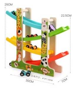 Circuit din lemn cu 4 piste și 6 mașinuțe – Tematică Zoo, 3 ani+