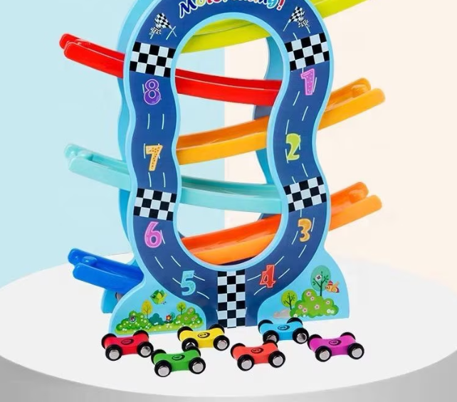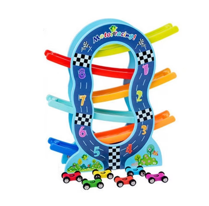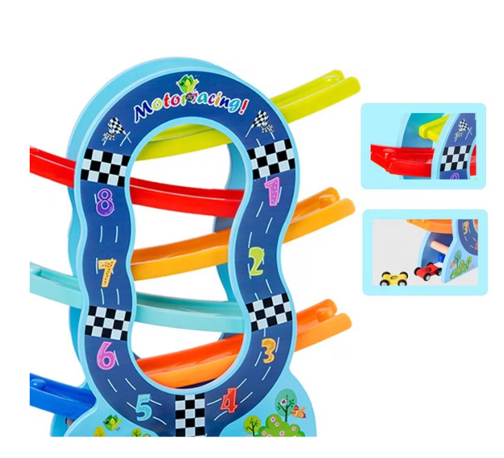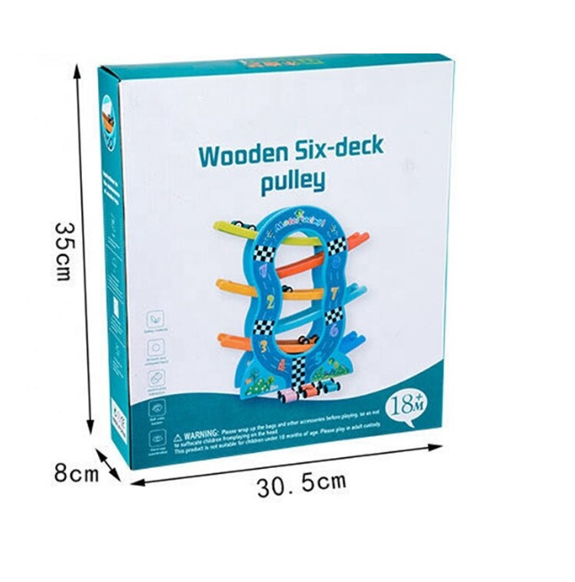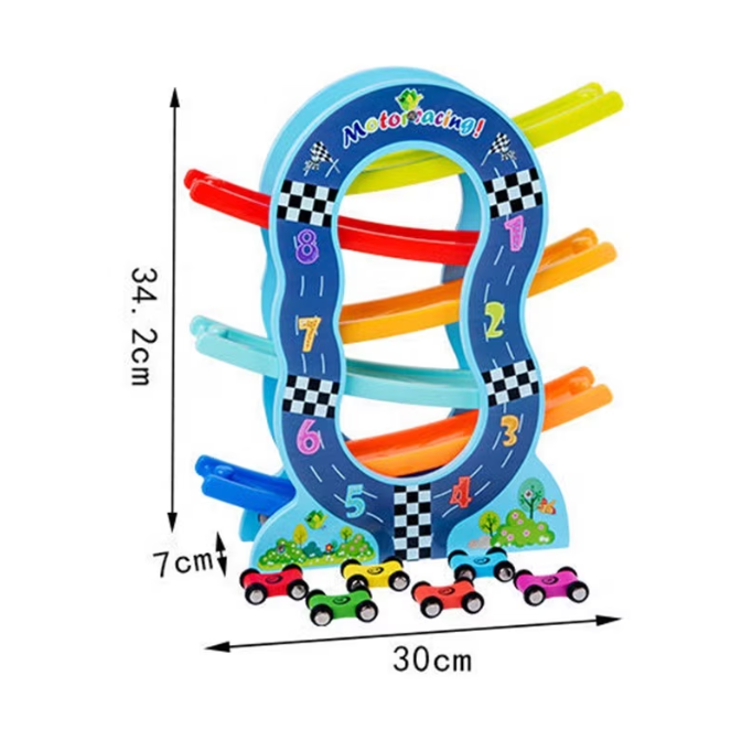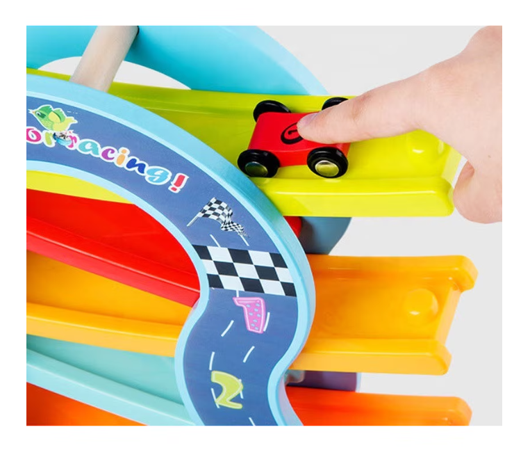 Acest circuit din lemn cu 6 piste colorate oferă o experiență de joacă captivantă pentru copiii mici. Fiecare dintre cele 6 mașinuțe colorate poate fi așezată în partea de sus a pistei și va aluneca cu viteză pe fiecare etaj, oferind ore întregi de distracție.