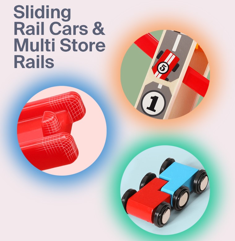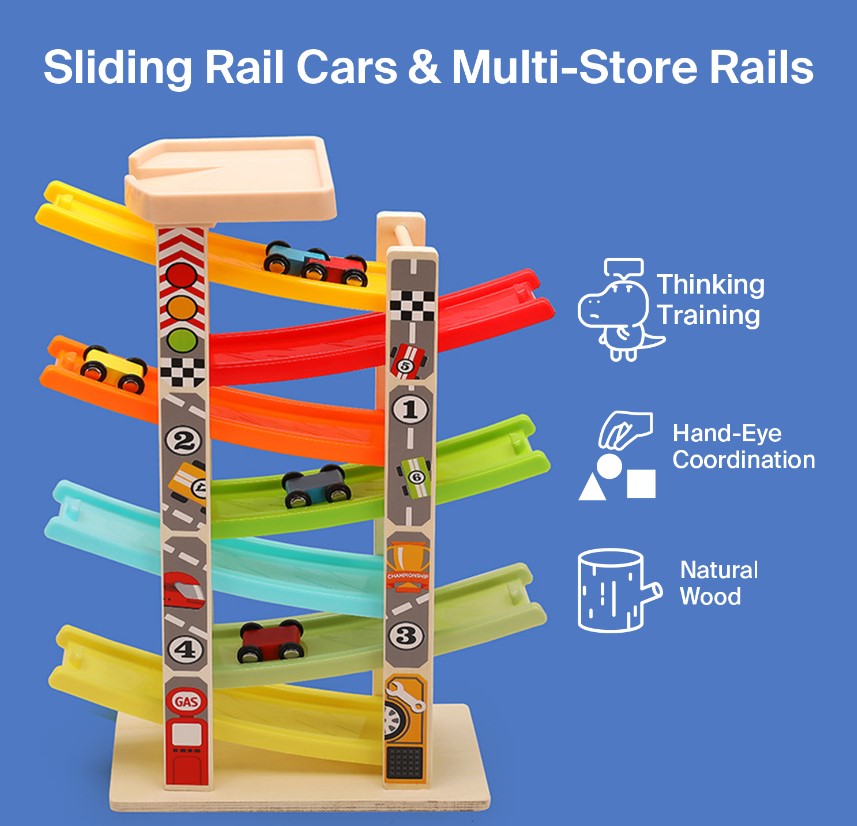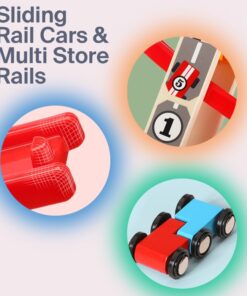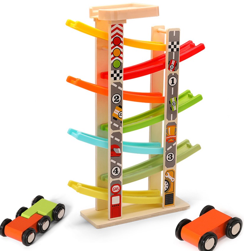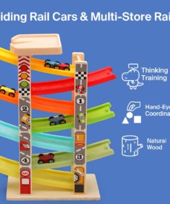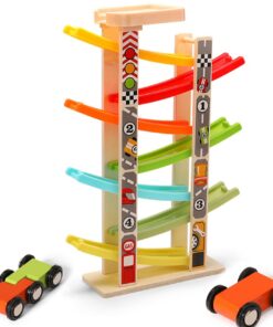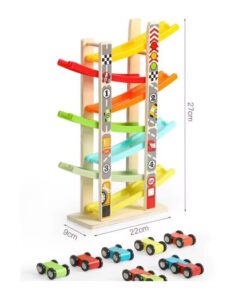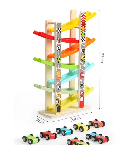 Construit din lemn rezistent, cu margini rotunjite și culori vii, acest circuit stimulează curiozitatea și atenția copilului, oferind ore întregi de distracție. Copiii vor putea observa cum mașinuțele alunecă pe piste colorate, coborând în zig-zag cu viteză, ceea ce le oferă o experiență senzorială și vizuală fascinantă.