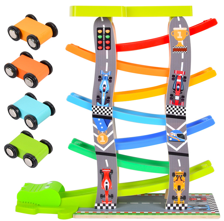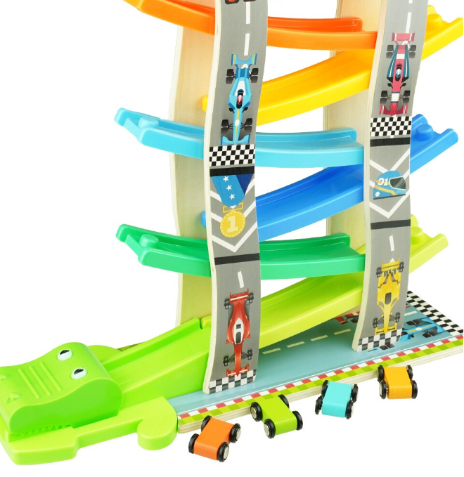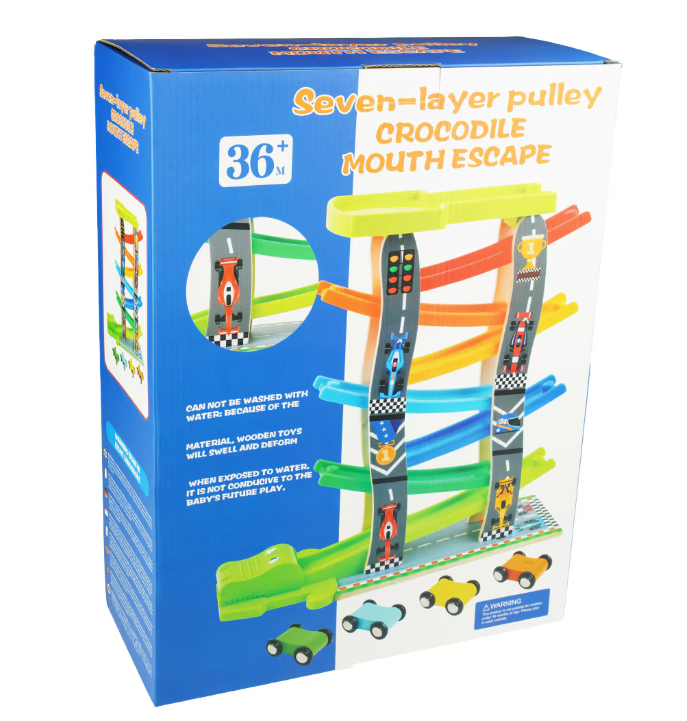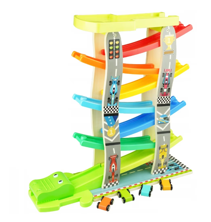 Acest circuit captivant din lemn este perfect pentru micii pasionați de curse! Cu 8 piste suprapuse și 4 mașinuțe colorate, această jucărie oferă ore întregi de distracție și competiție. Mașinuțele din lemn, cu roți silențioase, se întrec pe fiecare nivel al circuitului, alunecând cu viteză, răsturnându-se și învingând obstacolul final — un cap de crocodil verde care adaugă o notă de amuzament în cursă.