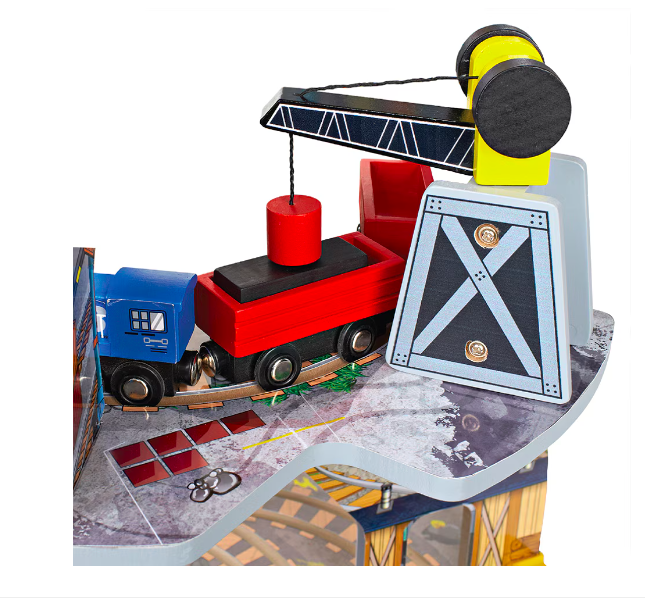 • Coordonare mână-ochi: Copiii își dezvoltă abilitățile motrice fine în timp ce manevrează trenulețele pe circuit și utilizează macaraua.