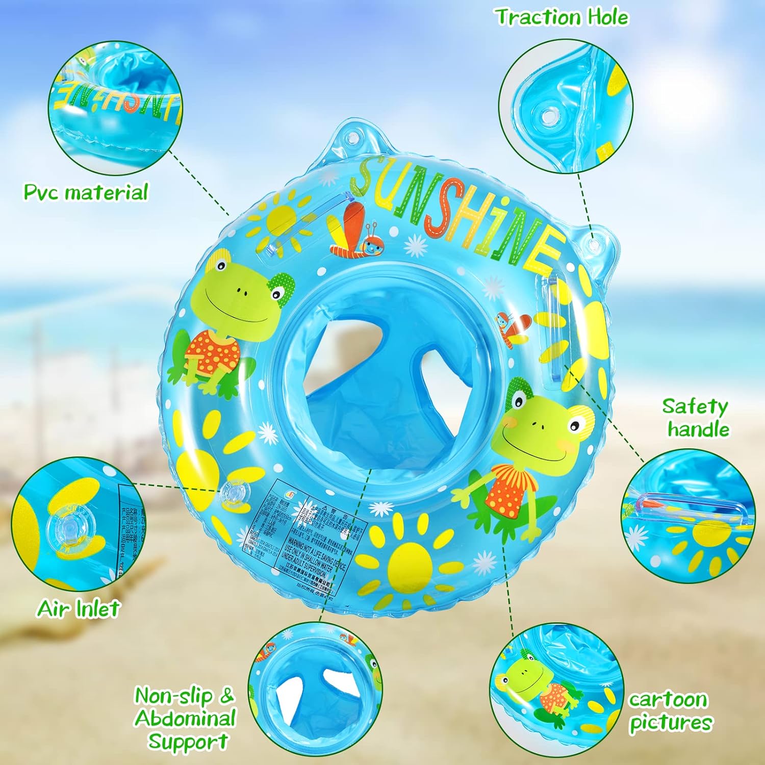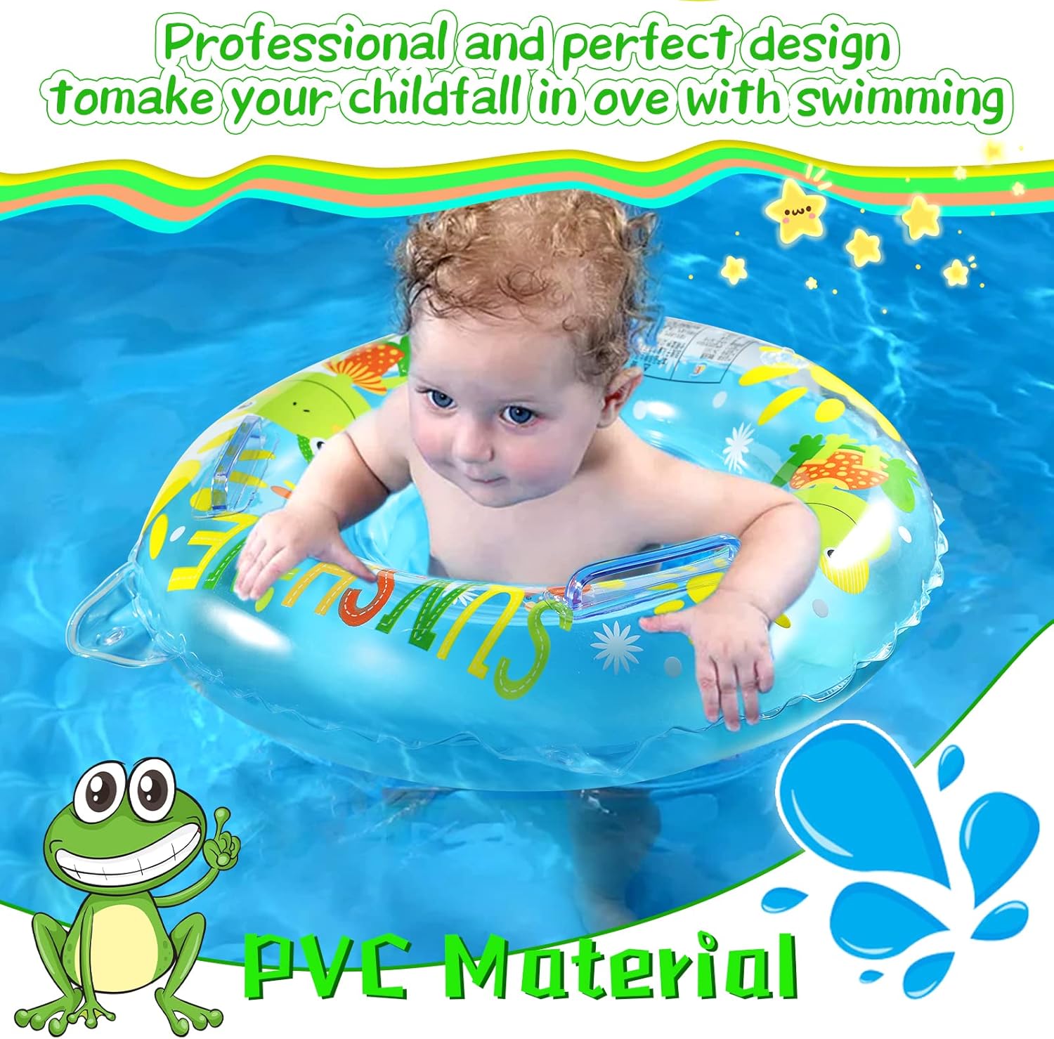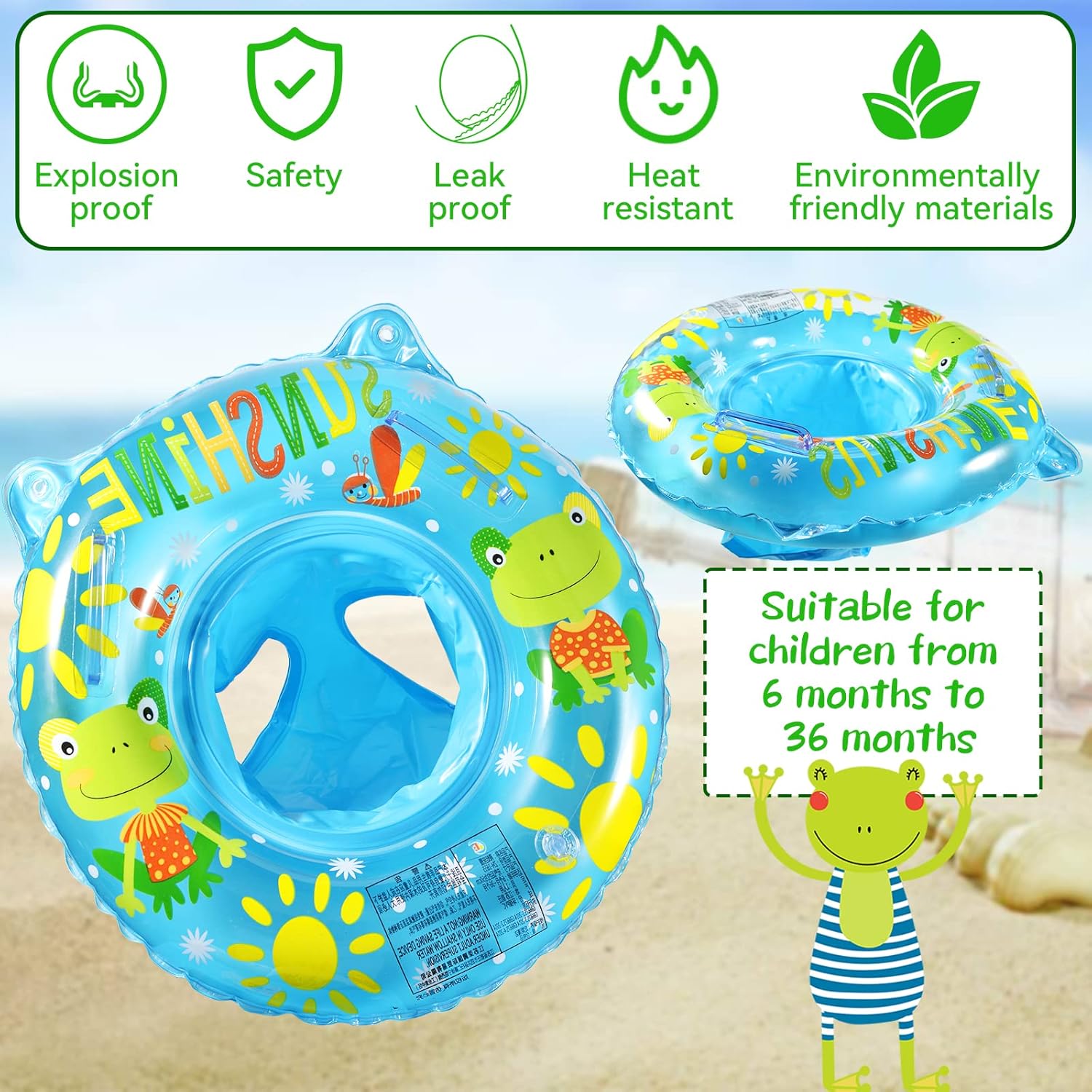 Transformă fiecare bălăceală într-o aventură veselă cu acest colac de înot adorabil, decorat cu broscuțe zâmbitoare și soare. Conceput special pentru copiii mici, colacul este prevăzut cu un scăunel tip chiloțel și mânere laterale pentru stabilitate, oferind sprijinul ideal pentru primele experiențe acvatice.