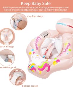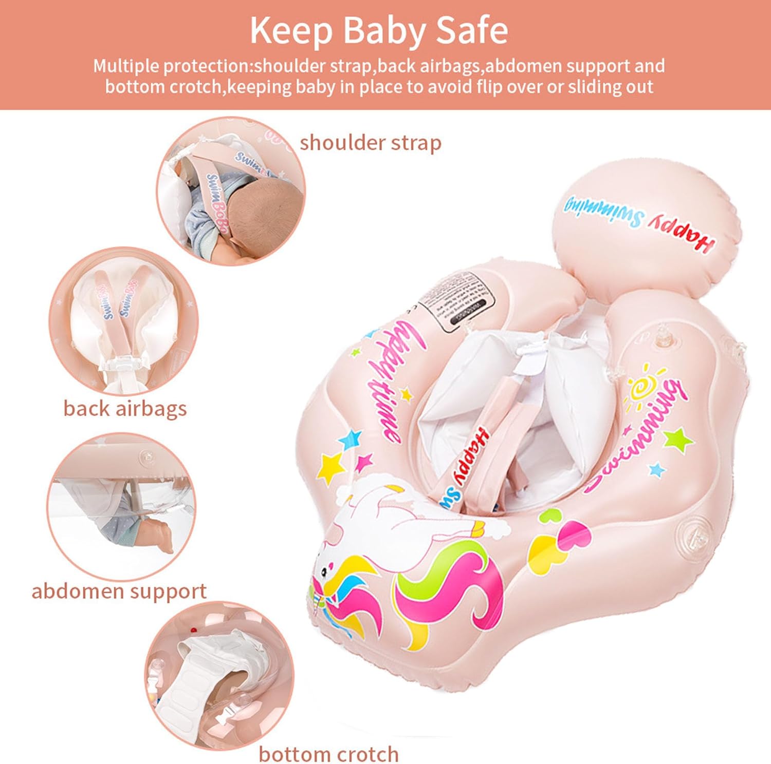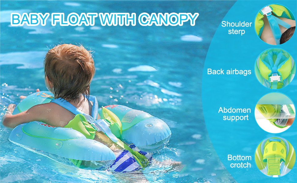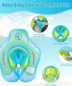 Prevăzut cu centuri reglabile în 5 puncte: bretele pentru umeri, suport lombar, susținere abdominală și chingă între picioare – pentru o fixare optimă și o poziție sigură a copilului în apă.Sistem anti-răsturnare: