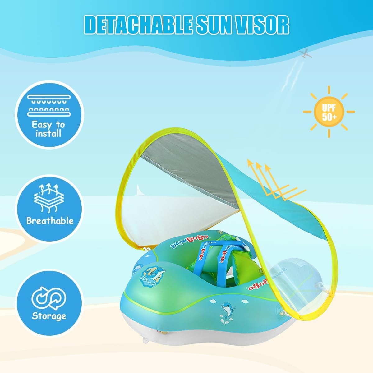 Pernele de aer din spate și forma ergonomică ajută la menținerea poziției corecte, reducând riscul de răsturnare sau alunecare.Parasolar detașabil cu protecție SPF 50+: