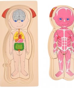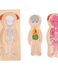 Puzzle educativ, stratificat, care identifica elementele componente principale din corpul fetitei: scheletul, creierul și sistemul digestiv, sistemul muscular, pielea.