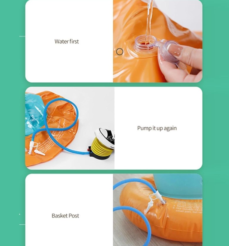 Umflă coșul de baschet în cele trei secțiuni: baza, corpul principal și inelul galben.