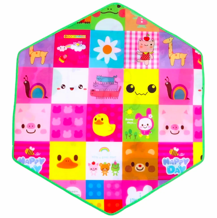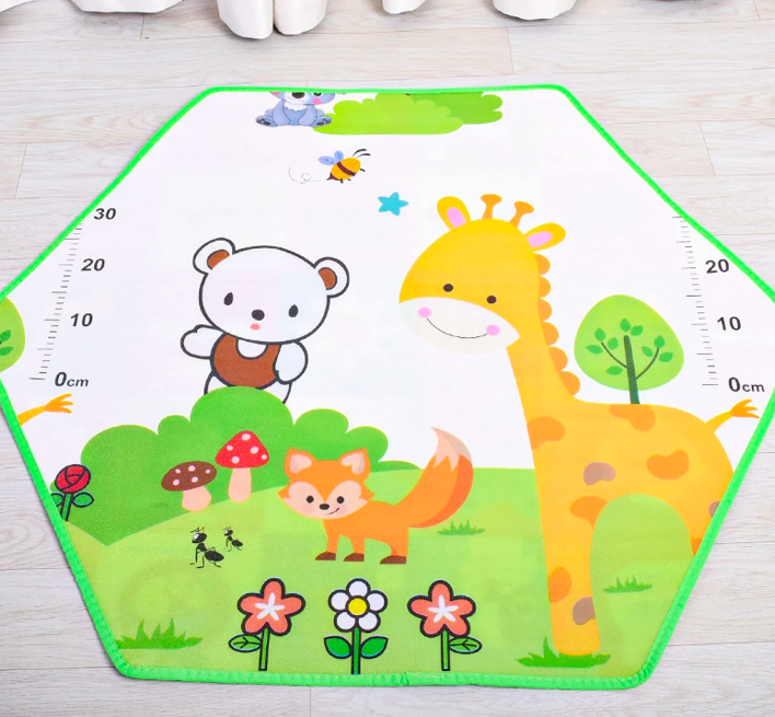 Acest covor de joacă tip hexagon, cu dimensiuni de 116 x 58 cm, oferă un spațiu sigur și educativ pentru copii. Este decorat cu diverse ilustrații educative, precum animale simpatice, elemente din natură, litere și cifre, ajutându-i pe cei mici să exploreze și să învețe într-un mod interactiv.