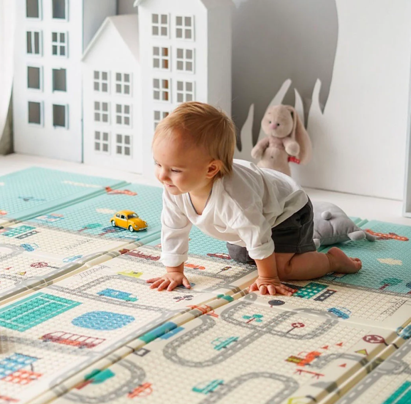 Covorasul de joaca este gros, pliabil, din spuma, cu 2 fete, pentru bebelusi.