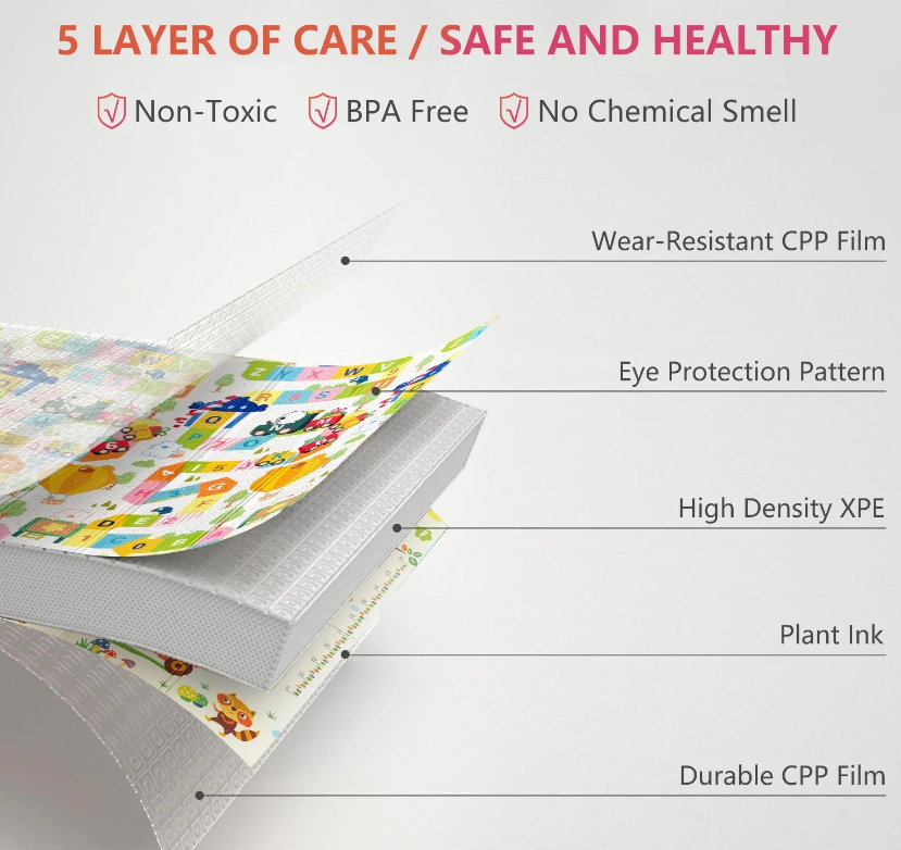 Material XPE premium: spumă moale, elastică, fără mirosuri sau substanțe toxice, certificată pentru uz infantil.
