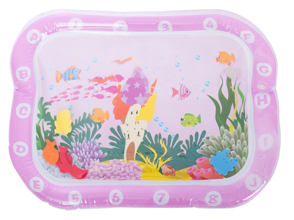 Pentru rezultate mai bune, poate fi umplut partial cu apa si partial cu aer. In interiorul covorasului sunt animale de apa colorate care se vor misca sub influenta miscarilor copilului.