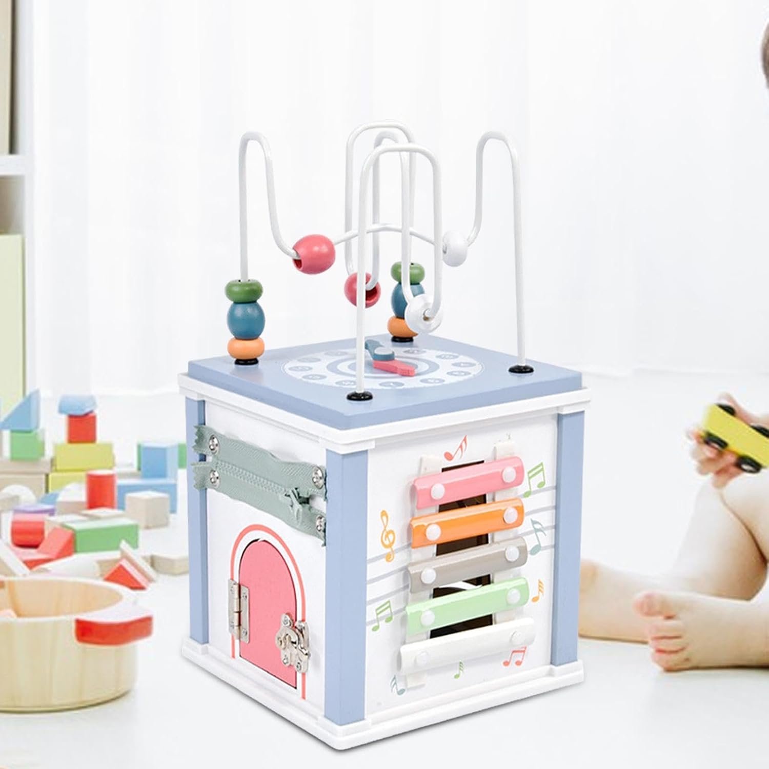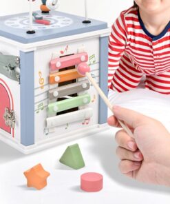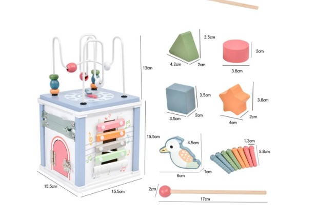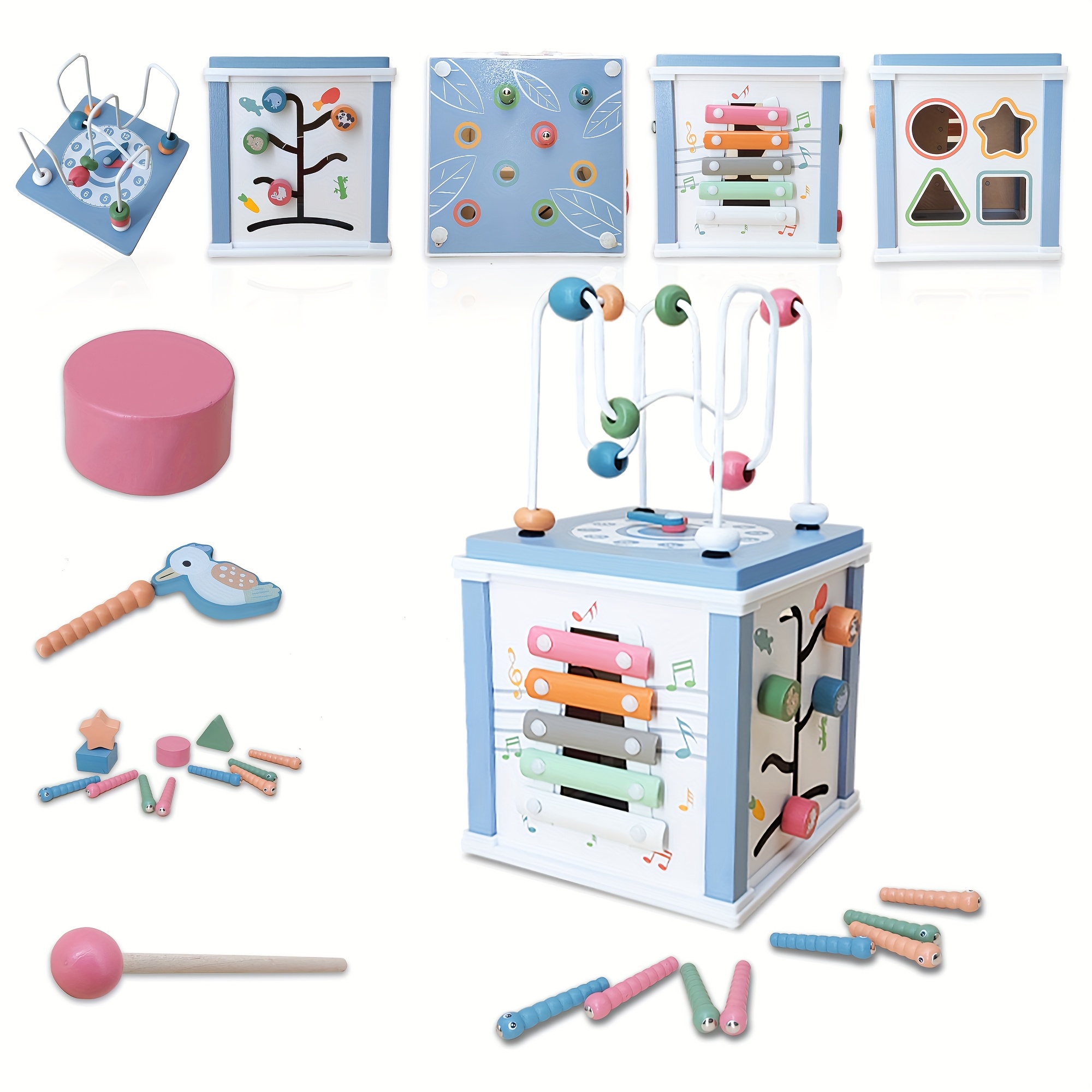 Cub educativ Montessori 10 în 1 din lemn, cu xilofon, sortator de forme, trasee cu biluțe, jocuri logice și activități interactive. Stimulează motricitatea și creativitatea copiilor 3 ani+.