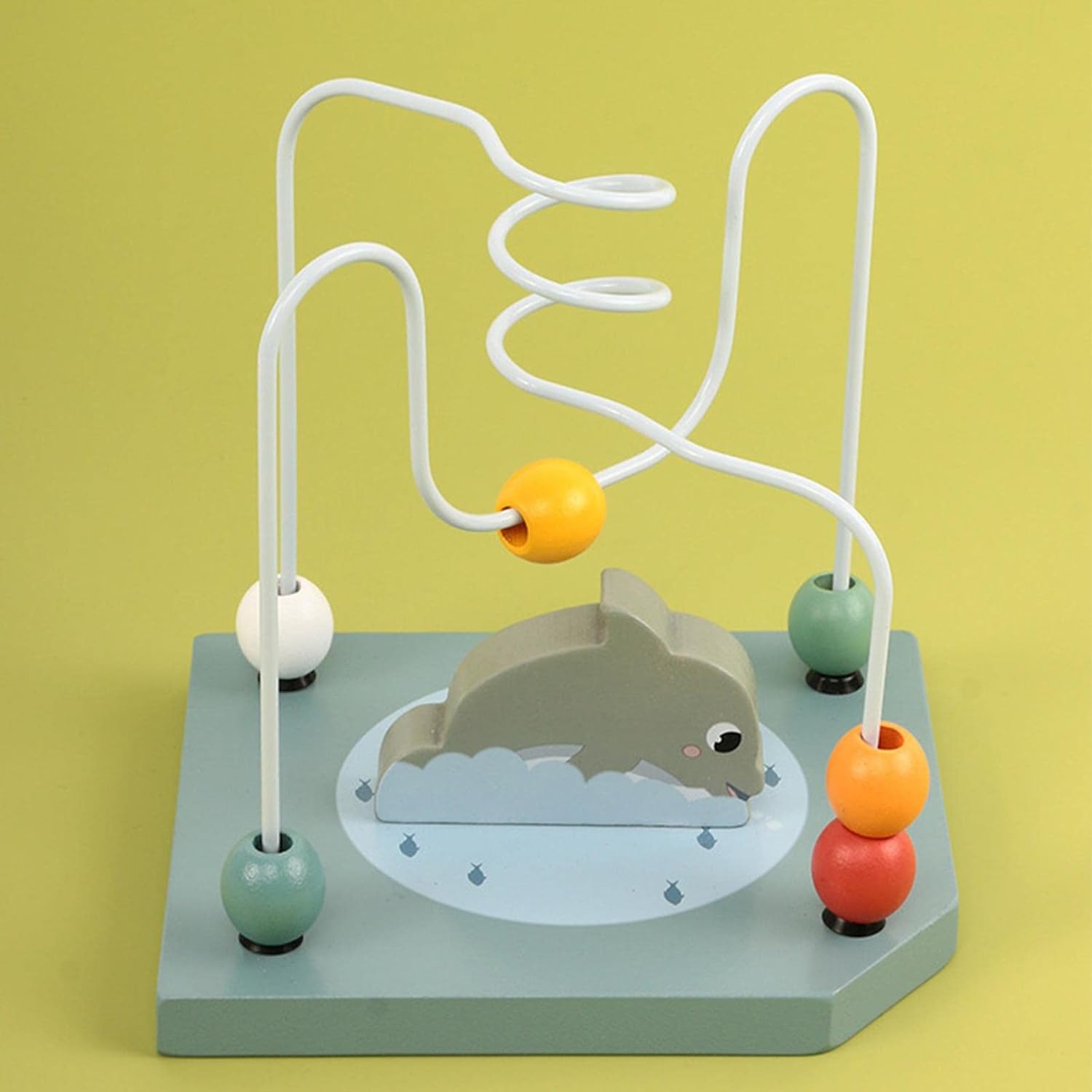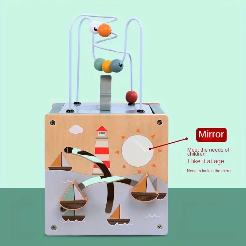 - În partea de sus a cubului interactiv din lemn există un labirint de motricitate cu margele, care poate fi îndepărtat și folosit separat.
