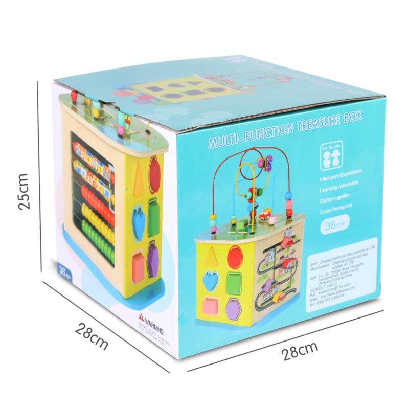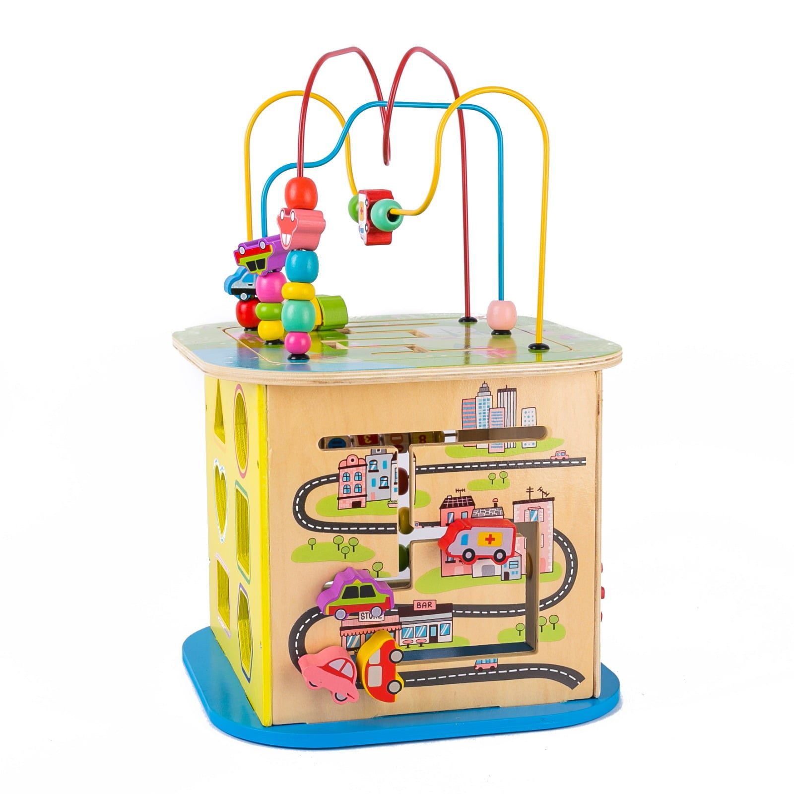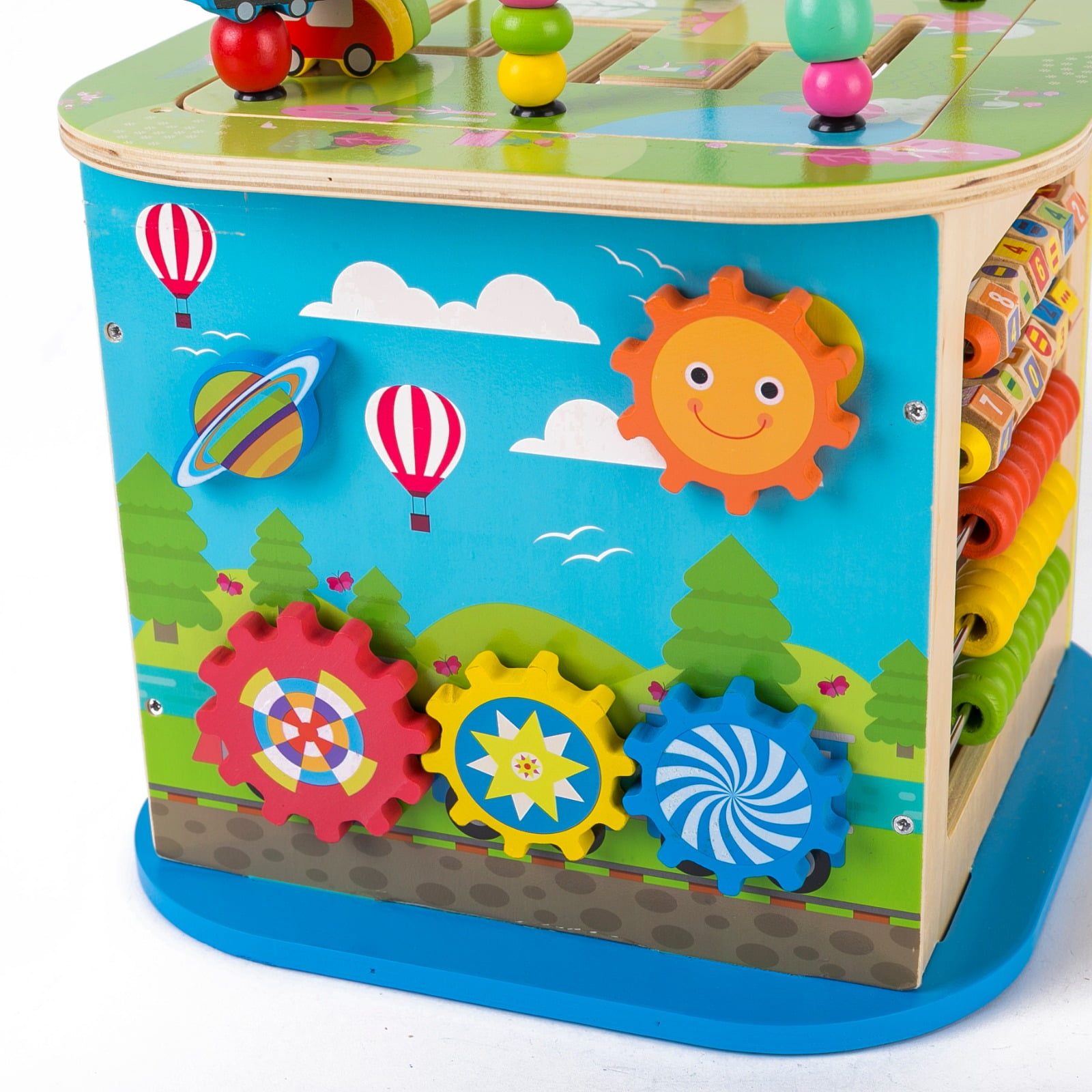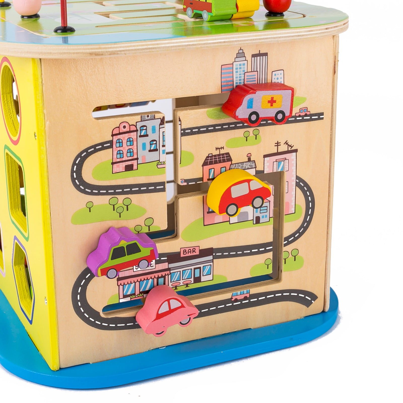 Cubul de activitati, de tip Montessori cu labirint masinute si roti zimtate este ideal pentru dezvoltarea coordonarii mana-ochi, abilitatilor motorii fine ale mainii, gandirii logice, dexteritatii, rabdarii si notiunilor despre cifre, litere, animale, culori, numarat, forme geometrice.