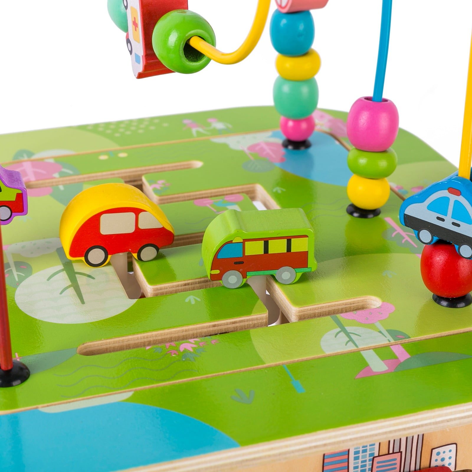 Jucaria cub educativ din lemn cu labirint masinute si roti zimtate o sa ii capteze atentia copilului inca de la inceput.