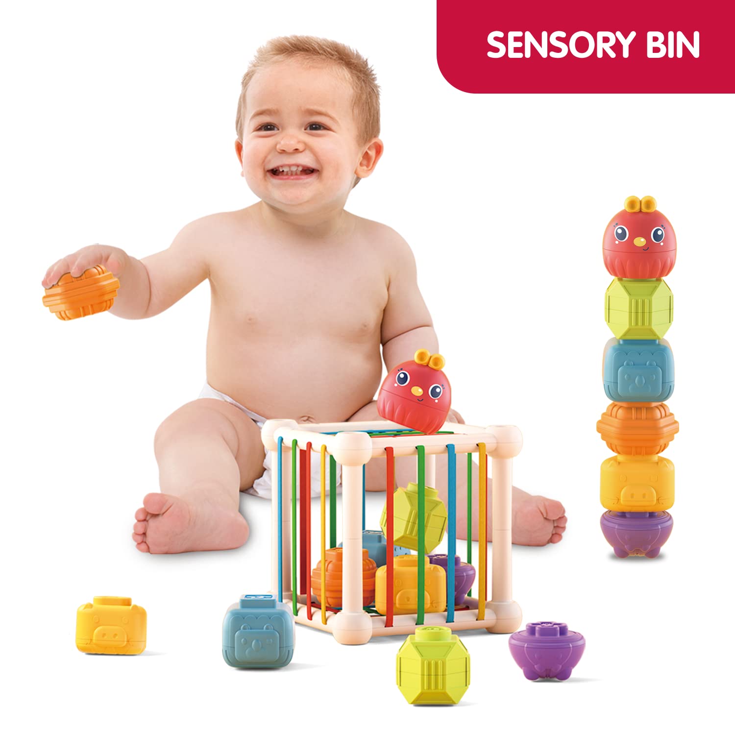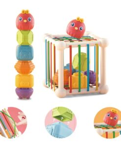 Un centru senzorial complet pentru bebeluși, ideal pentru explorarea timpurie a formelor, culorilor și sunetelor. Cubul este prevăzut cu benzi elastice moi, prin care cei mici pot introduce și extrage diverse forme geometrice, dezvoltându-și motricitatea fină și coordonarea mână-ochi.