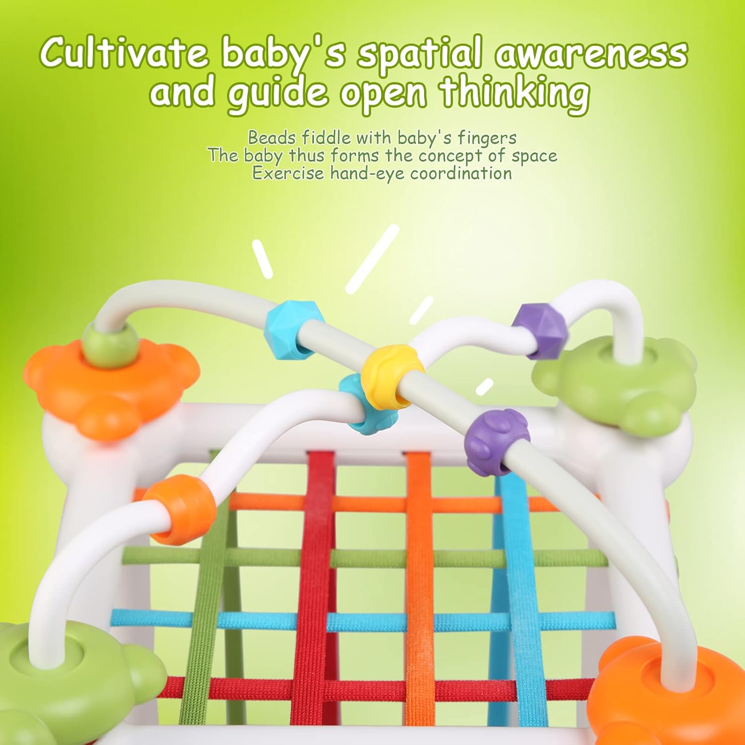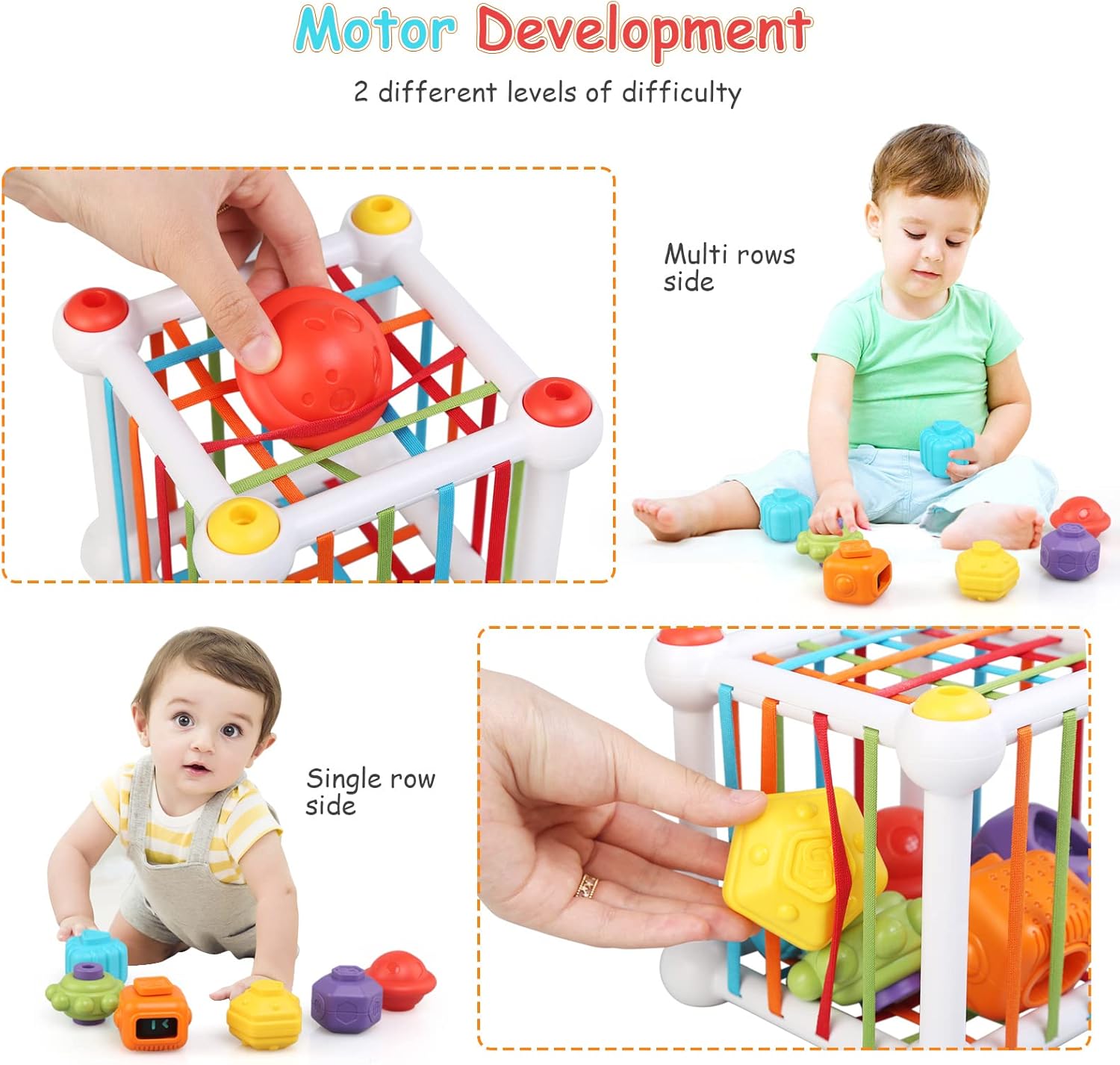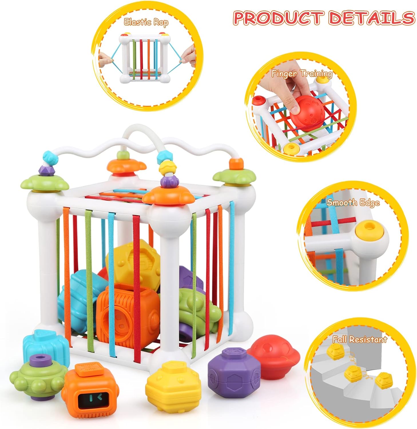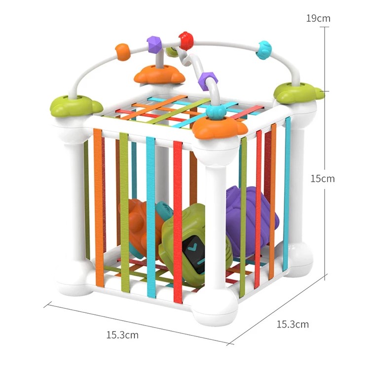 Cubul are benzi elastice flexibile prin care copiii pot introduce și extrage formele geometrice și jucăriile moi, dezvoltând astfel dexteritatea și coordonarea ochi-mână. Blocurile incluse au texturi și forme variate, iar unele funcționează ca zornăitori senzoriale, atrăgând atenția bebelușului prin sunete și senzații diferite.