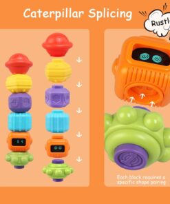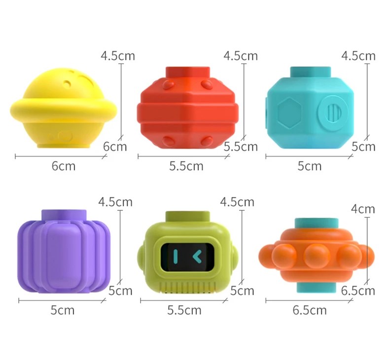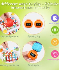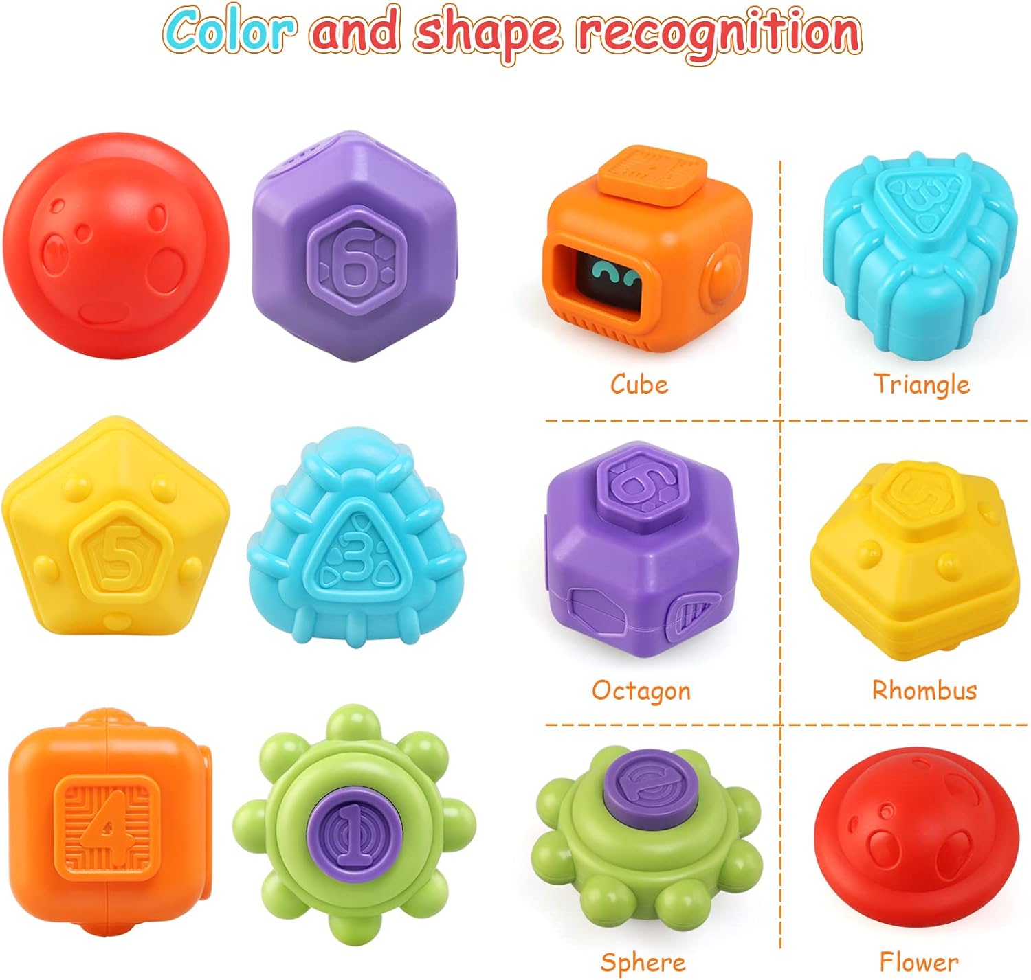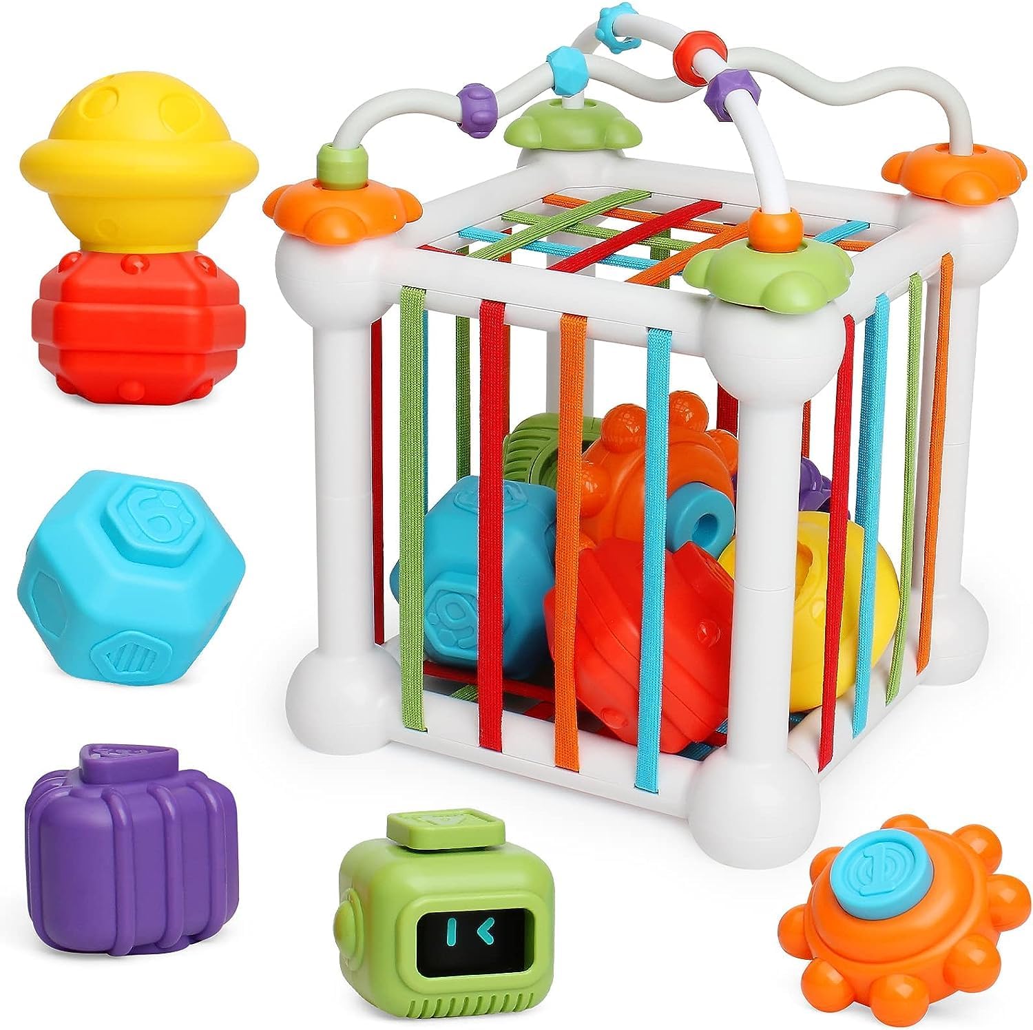 Cubul are benzi elastice flexibile prin care copiii pot introduce și extrage formele geometrice și jucăriile moi, dezvoltând astfel dexteritatea și coordonarea ochi-mână. Blocurile incluse au texturi și forme variate, iar unele funcționează ca zornăitori senzoriale, atrăgând atenția bebelușului prin sunete și senzații diferite.