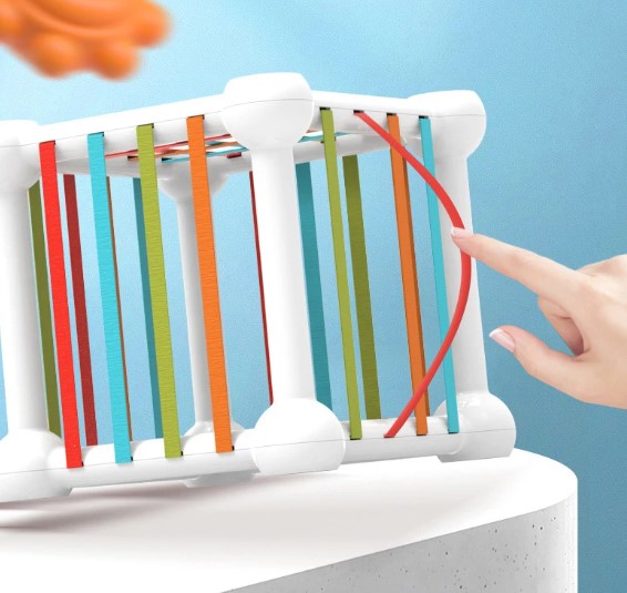 Sortare forme – copilul introduce blocurile prin benzile elastice și le recuperează, exersând răbdarea și precizia.