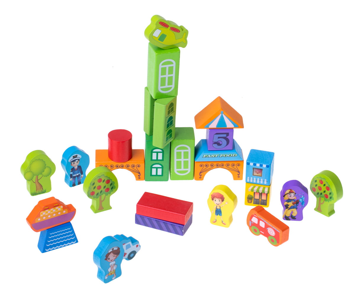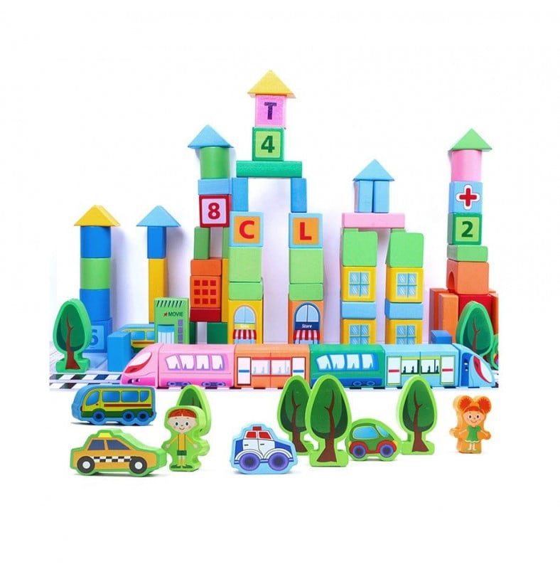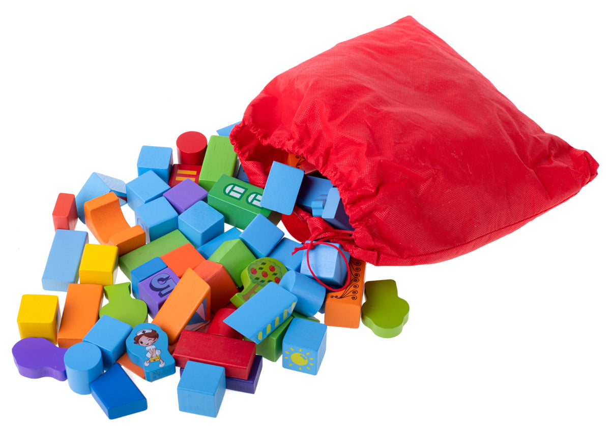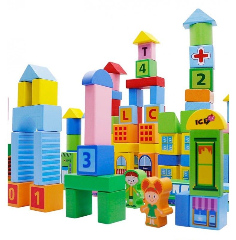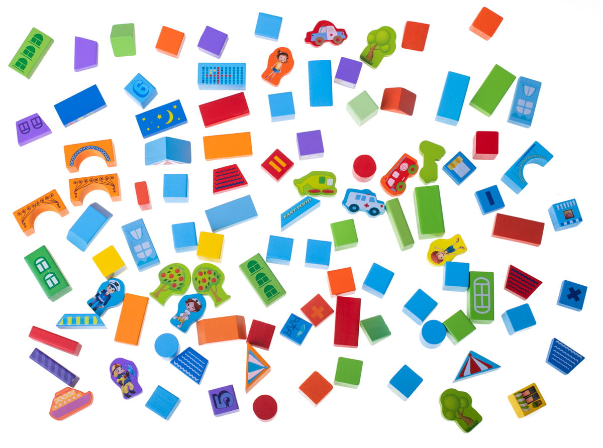 Acest set educativ de constructie are in componenta 100 cuburi de constructie din lemn, in culori vibrante si joc de sortare forme geometrice. Cuburile vin depozitate intr-o galetusa, care are un capac cu sortator pentru formele geometrice ale setului.