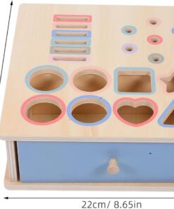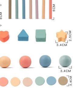 Conținut: 1 cutie din lemn cu sertar, 4 seturi de piese geometrice și cilindrice în culori pastelate