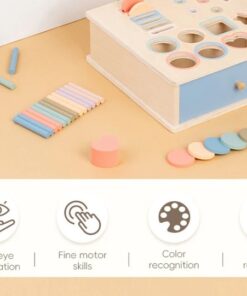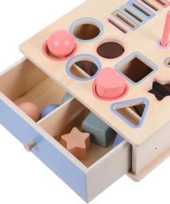 Jocul include multiple activități într-o singură cutie: sortarea formelor geometrice, recunoașterea culorilor, coordonarea mână–ochi și exersarea principiului permanenței obiectului.