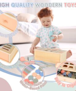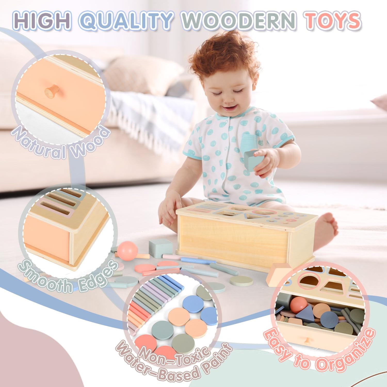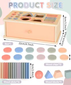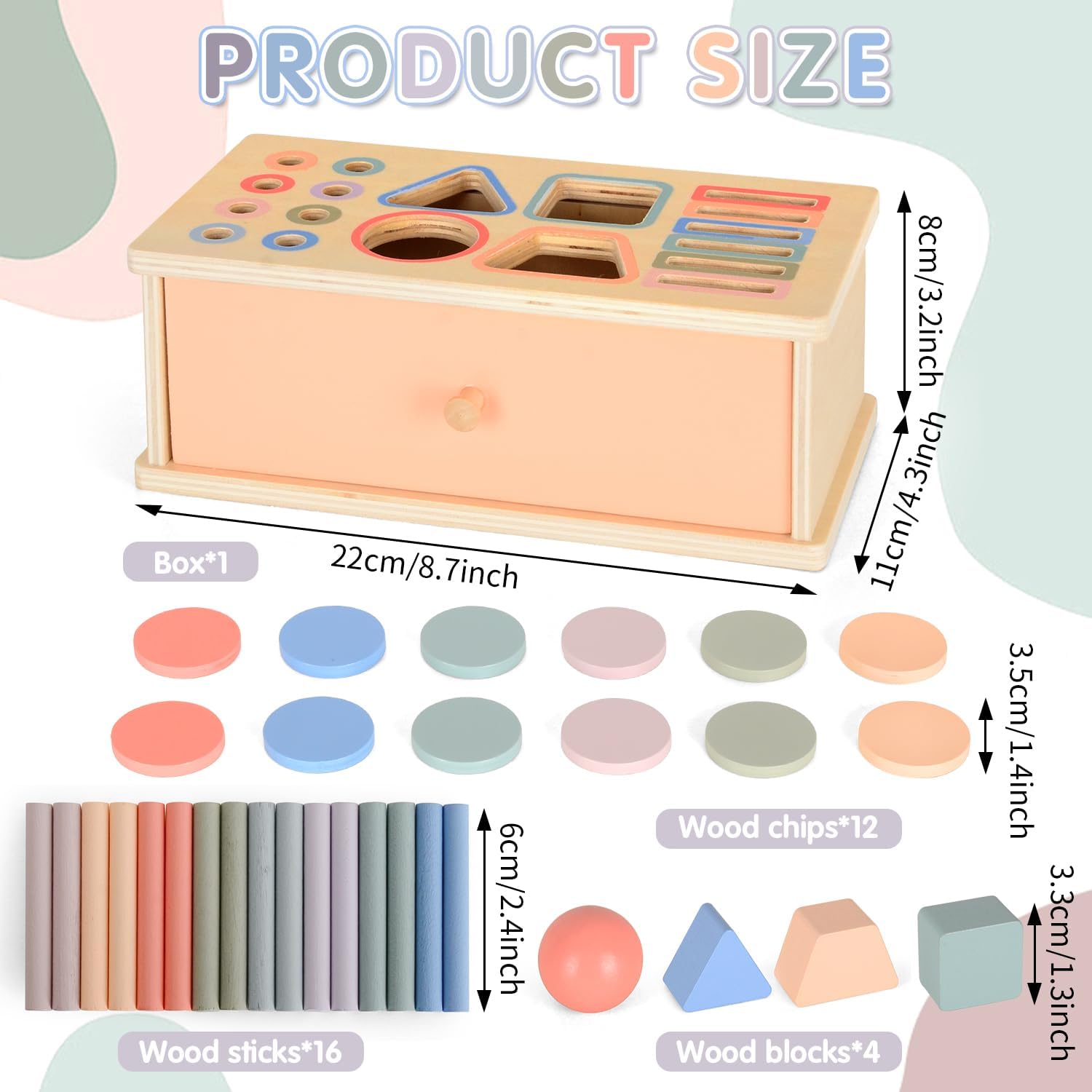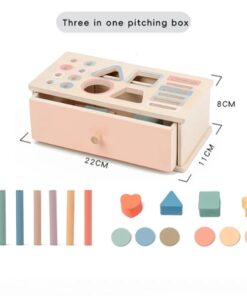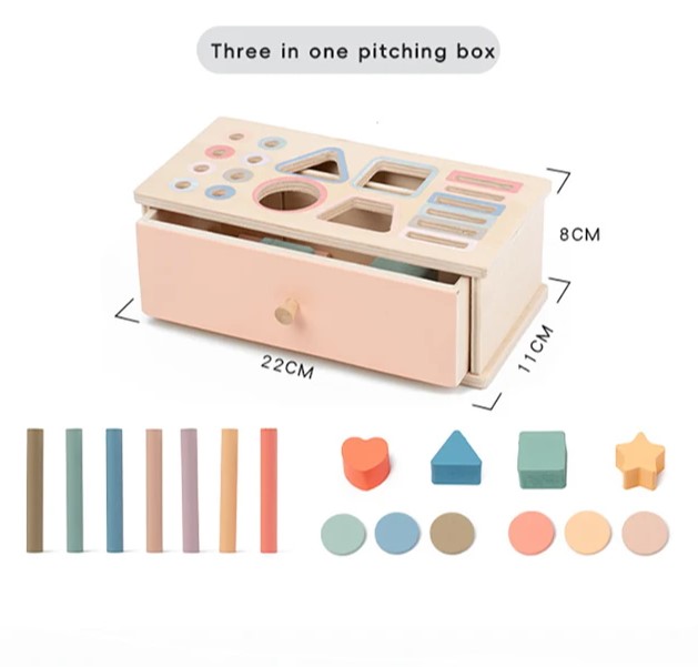 Cutia permanenței Montessori 4 în 1 este un material educațional esențial pentru dezvoltarea timpurie a copiilor. Construită din lemn natural, vopsit cu culori pastelate pe bază de apă, aceasta include multiple piese geometrice (cercuri, sfere, cuburi, triunghiuri, bețe cilindrice și discuri) care pot fi introduse prin fante corespunzătoare pe capac. Designul său robust, cu sertar glisant, permite recuperarea pieselor și repetarea activității, stimulând astfel interesul și perseverența copilului.