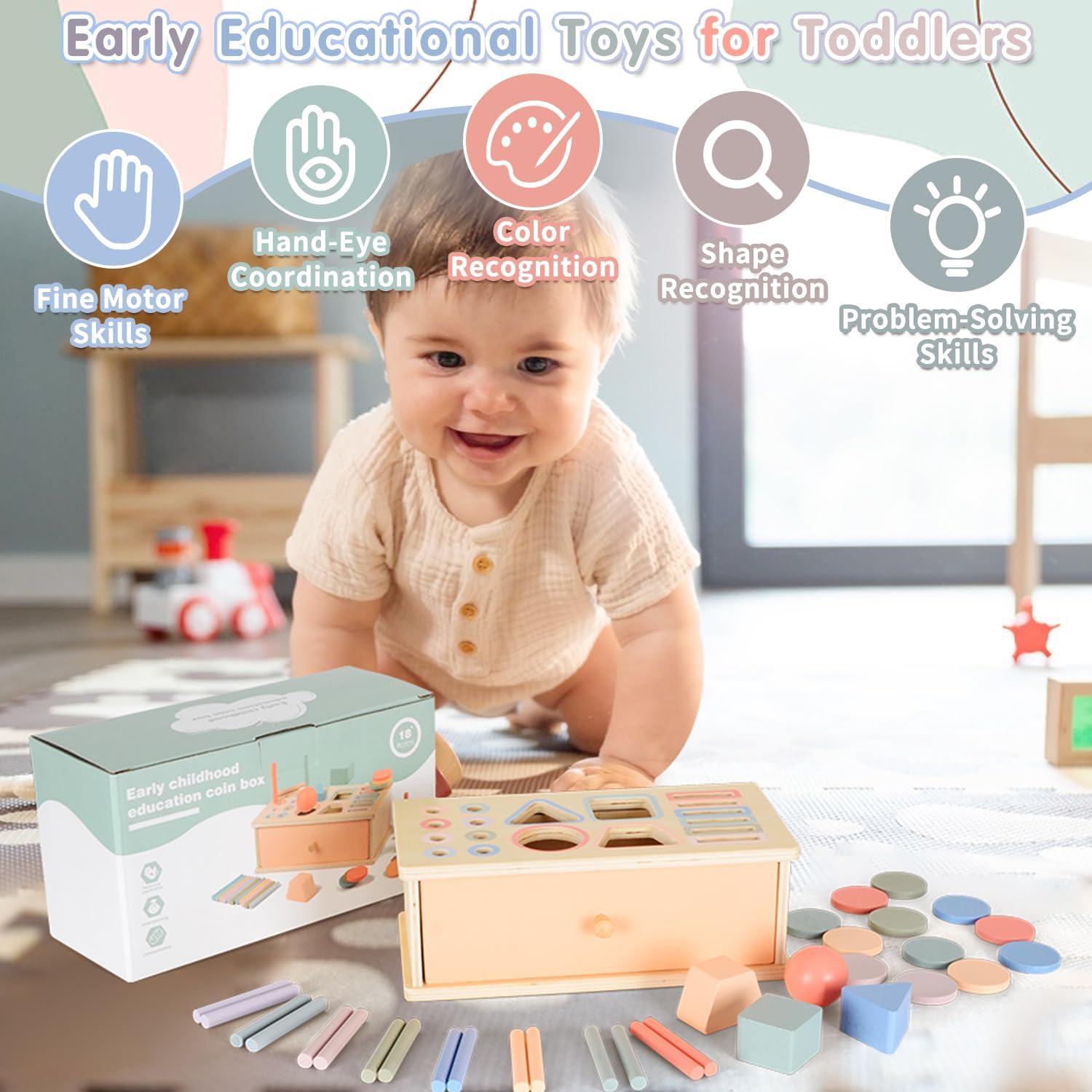 Copilul învață că un obiect continuă să existe chiar și atunci când nu îl mai vede. Introducerea pieselor în cutie și descoperirea lor din nou în sertar dezvoltă încrederea și siguranța copilului în relația cauză-efect.Sortare după forme și culori