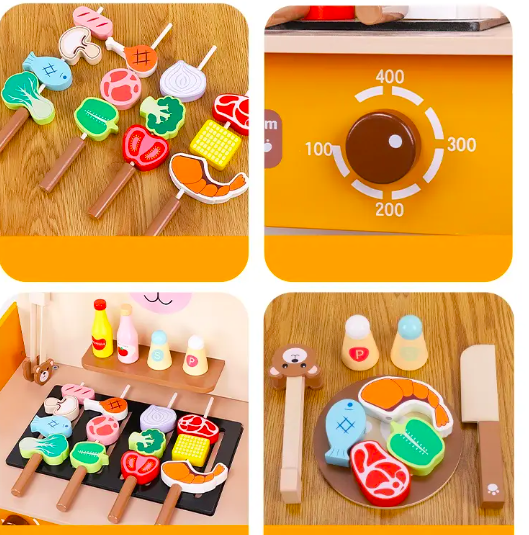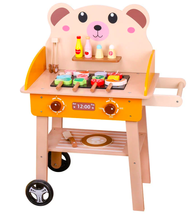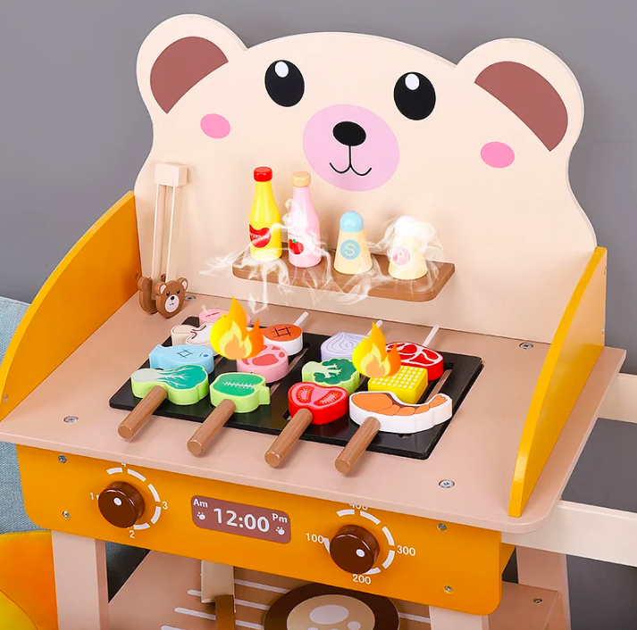 Grătar din lemn pentru copii cu accesorii – Set joc de rol educativ, 3 ani+ este jucăria ideală pentru micuții care doresc să-și dezvolte abilitățile sociale și creative într-un mod distractiv și interactiv. Acest set de grătar de jucărie este construit din lemn de calitate superioară și este decorat cu un design prietenos de ursuleț, care va captiva atenția copiilor. Include o varietate de accesorii realiste, precum ustensile, sticle cu „condimente” și alimente detașabile în formă de fripturi, legume și fructe de mare, oferindu-le micilor bucătari o experiență completă de gătit.