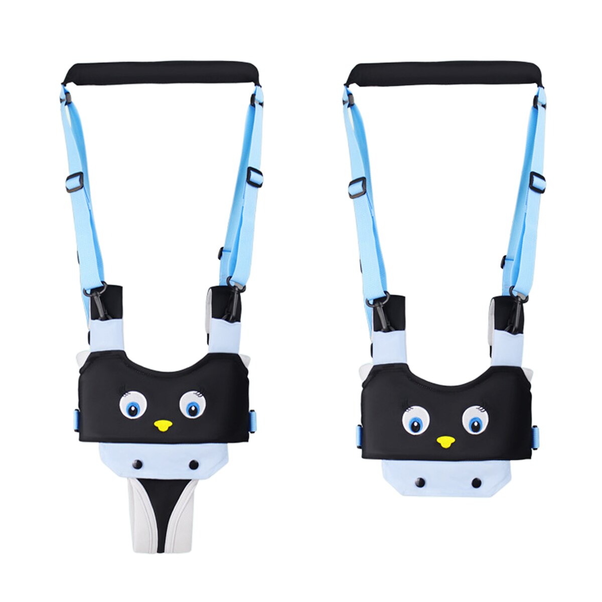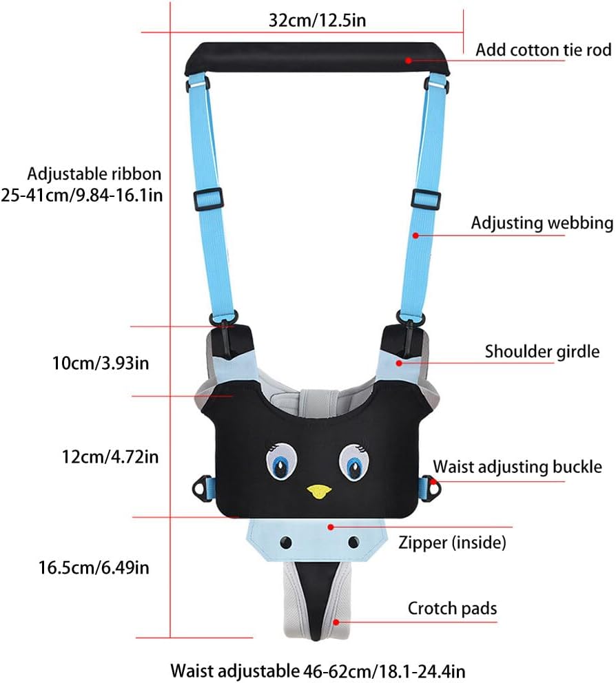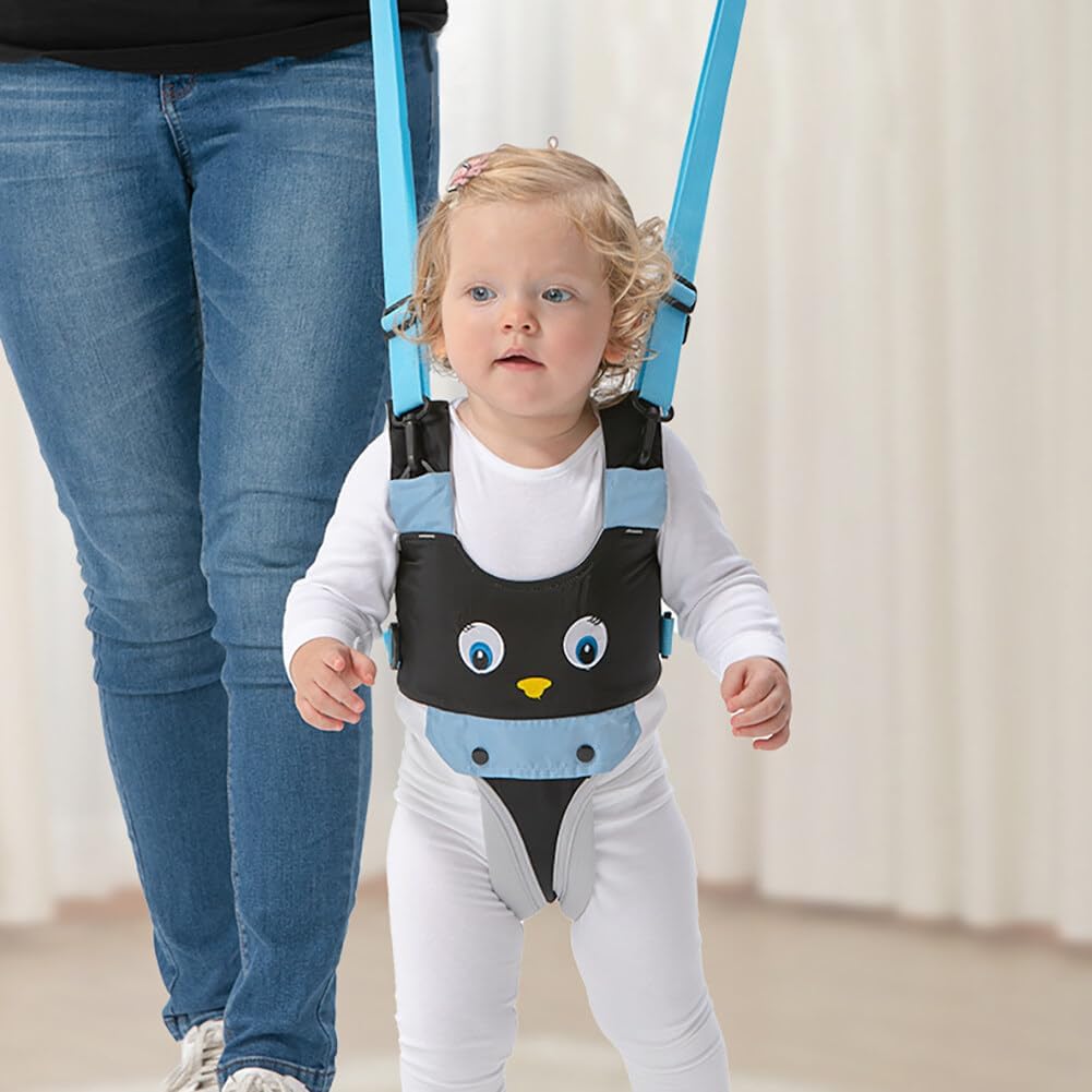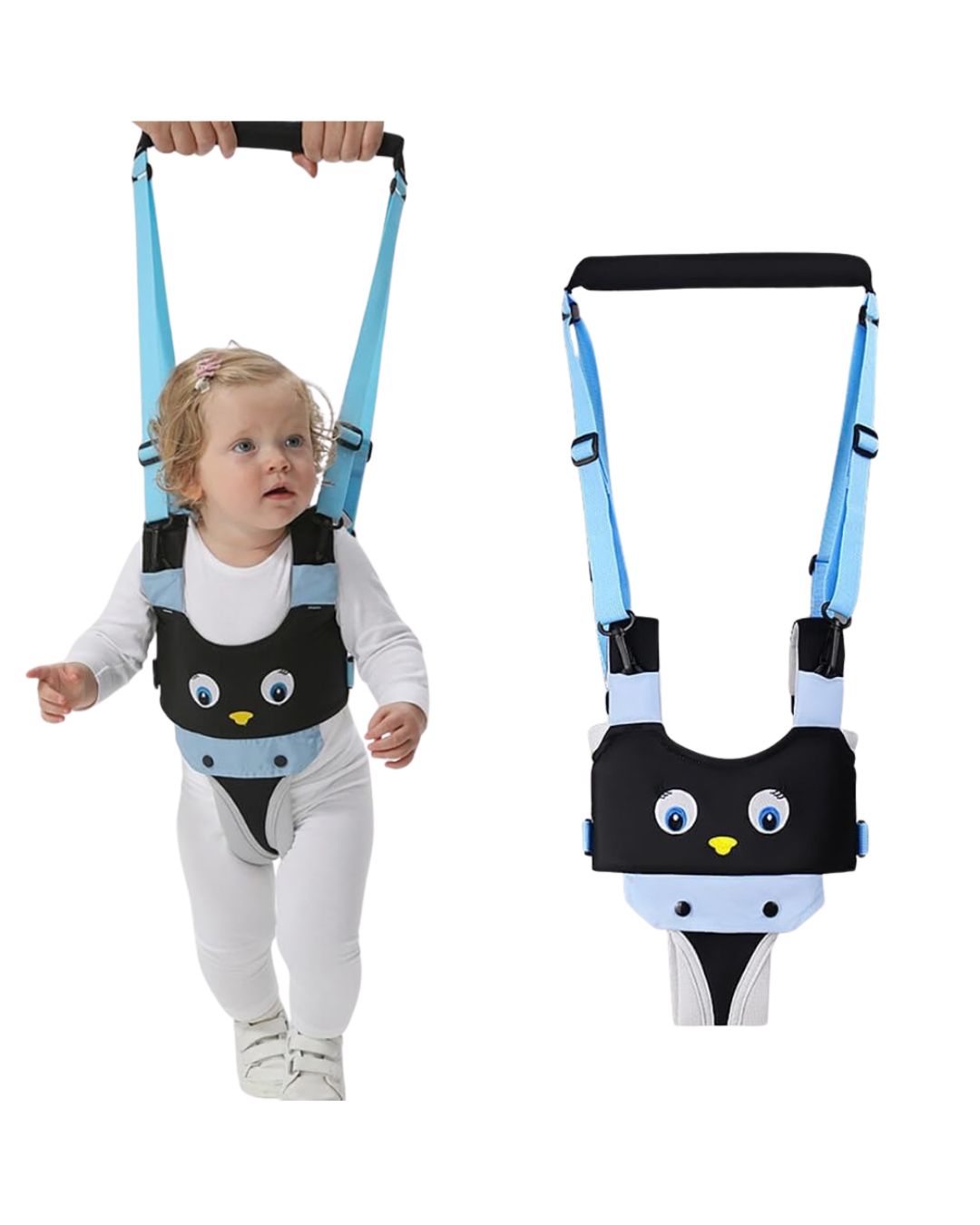 Bretelele reglabile permit ajustarea rapidă a hamului în funcție de înălțimea copilului și de confortul părintelui. Mânerul superior oferă control și stabilitate în timpul mersului.