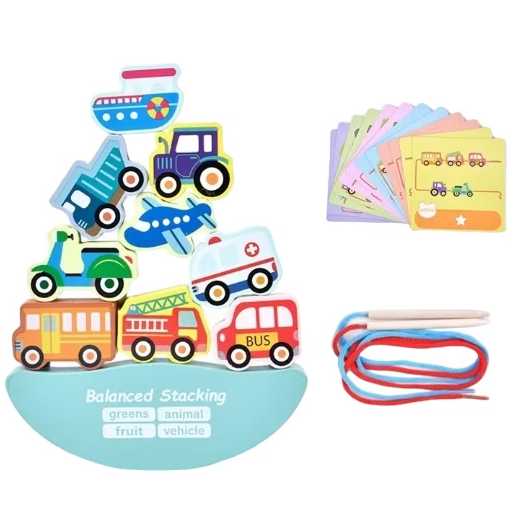 Acest joc 3 în 1 este o jucărie educativă extrem de versatilă, concepută pentru a dezvolta abilitățile cognitive și motrice ale copiilor cu vârsta de peste 3 ani. Jucăria este formată din piese reprezentând mijloace de transport viu colorate, realizate din lemn de calitate, șnururi pentru activitatea de șnuruire, carduri de joc logice și o bază pentru echilibrare.