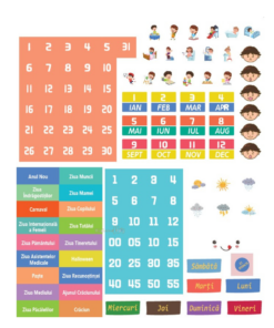 Piese magnetice cu: zilele săptămânii, lunile anului, numere, sărbători, stări meteo, stări emoționale