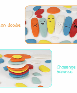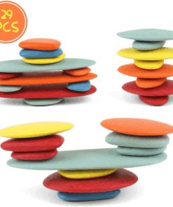 - Joc de echilibru: Copilul poate stivui pietricelele în diverse aranjamente, dezvoltând controlul musculaturii fine și înțelegerea relației cauză-efect. Acest tip de activitate îmbunătățește percepția vizual-spațială și răbdarea.