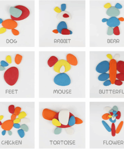 - Puzzle creativ: Prin utilizarea cartonașelor model, copilul poate recrea imagini, învățând să recunoască forme și culori, stimulând gândirea logică și creativitatea.