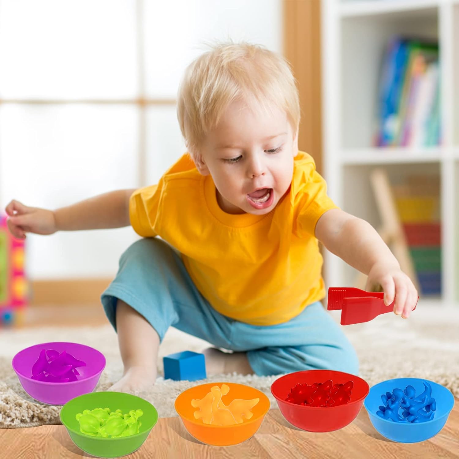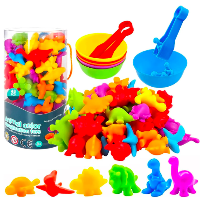 - Set complet: Include 48 de dinozauri colorați în 6 culori diferite, 6 boluri asortate și 2 clești ergonomici, totul într-o cutie de depozitare practică.