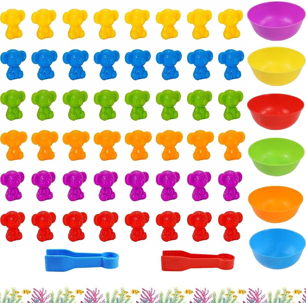 - Set complet: Include 48 de ursuleți colorați în 6 culori diferite, 6 boluri asortate și 2 clești ergonomici, totul într-o cutie de depozitare practică.