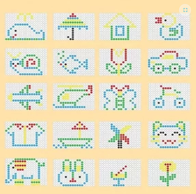 Copilul poate începe prin a recrea modelele din planșele incluse, exersând asocierea culorilor și poziționarea corectă.