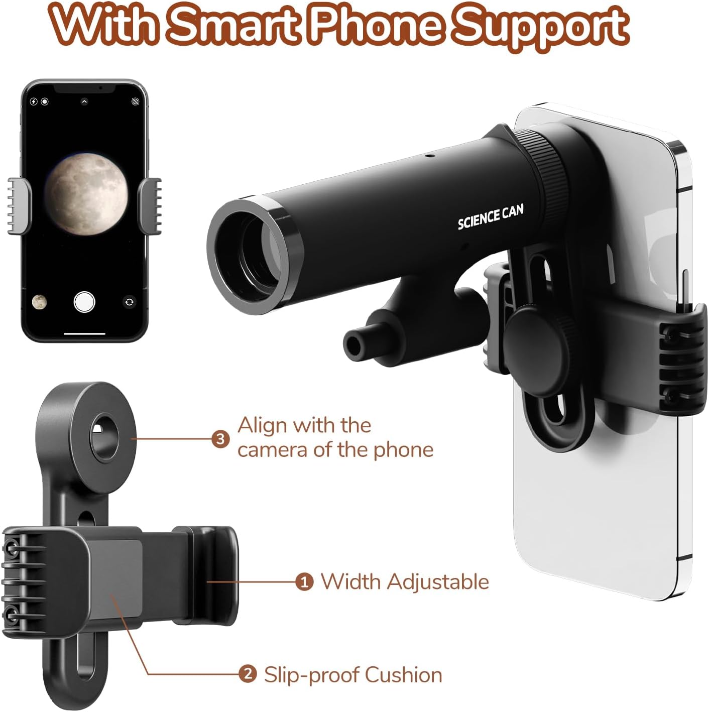 ✔ Suport pentru smartphone – copiii pot atașa telefonul mobil pentru a fotografia sau filma ceea ce observă.