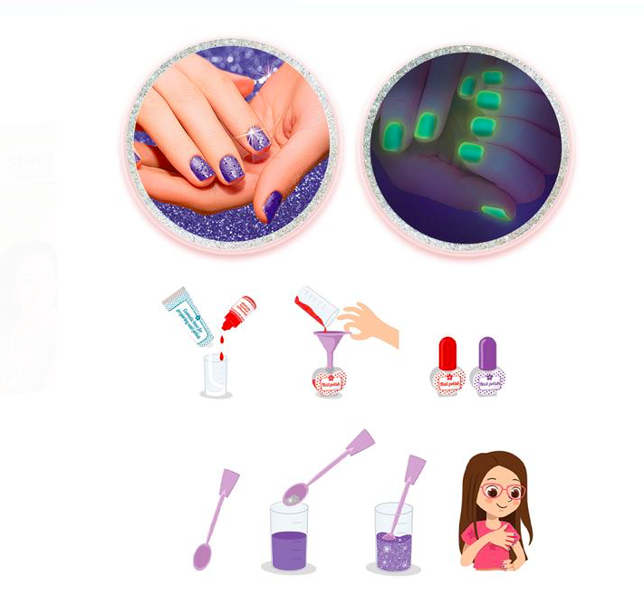 Cu ajutorul bazei pentru prepararea lacului de unghii, coloranților și glitterului, copiii pot realiza oje personalizate, iar oja fosforescentă le va permite să creeze efecte spectaculoase care strălucesc în întuneric! Bancul de lucru special conceput facilitează mixarea culorilor și aplicarea acestora într-un mod ordonat și igienic.