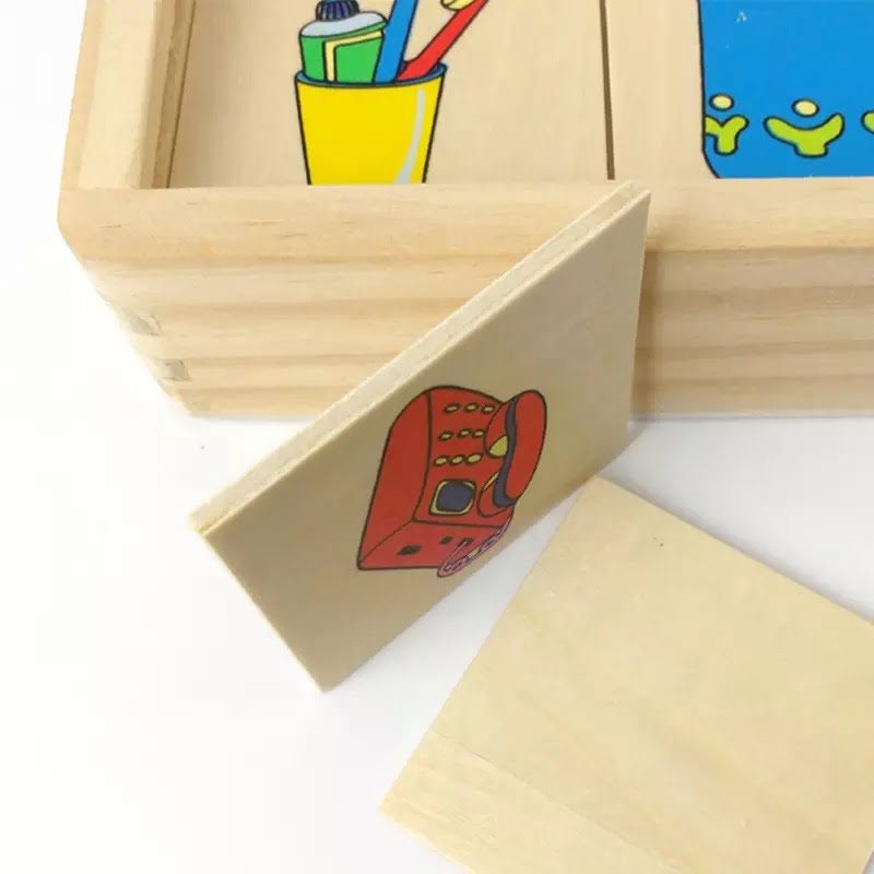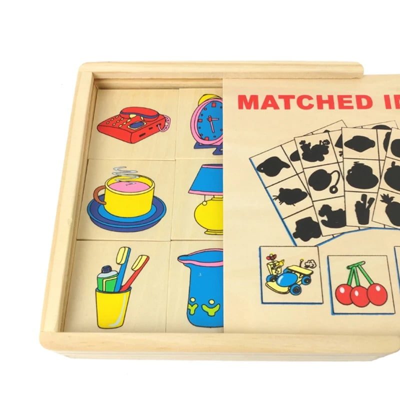 - Cutia din lemn include 36 de carduri din lemn cu imaginile reale si 4 piese mari cu cate 9 imagini in umbra.