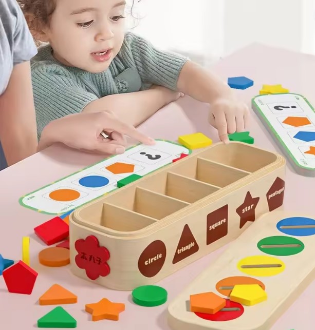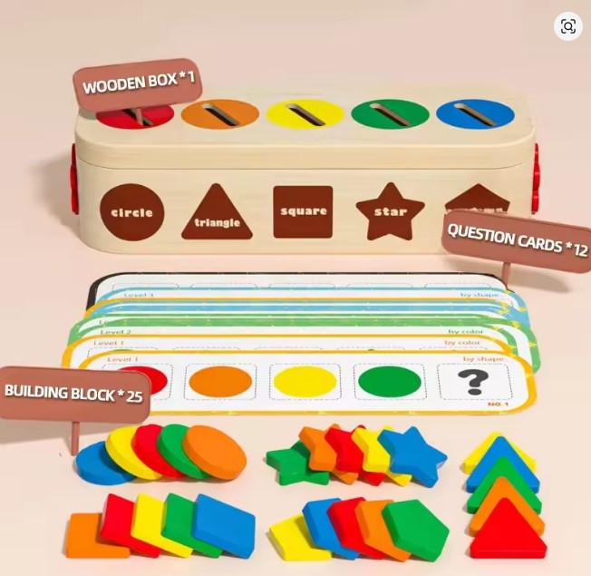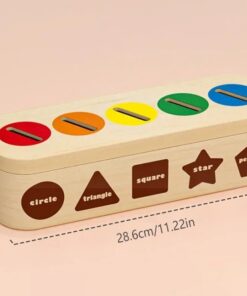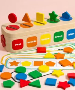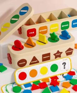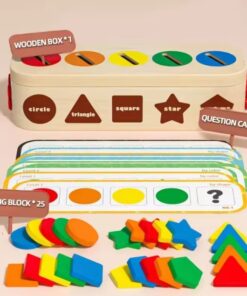 Acest joc educativ din lemn este ideal pentru copiii de la 3 ani, ajutându-i să învețe într-un mod distractiv culorile și formele geometrice. Setul conține o cutie de sortare cu fante corespunzătoare și un set de cartonașe cu exerciții care ghidează copilul în activități de asociere și clasificare.