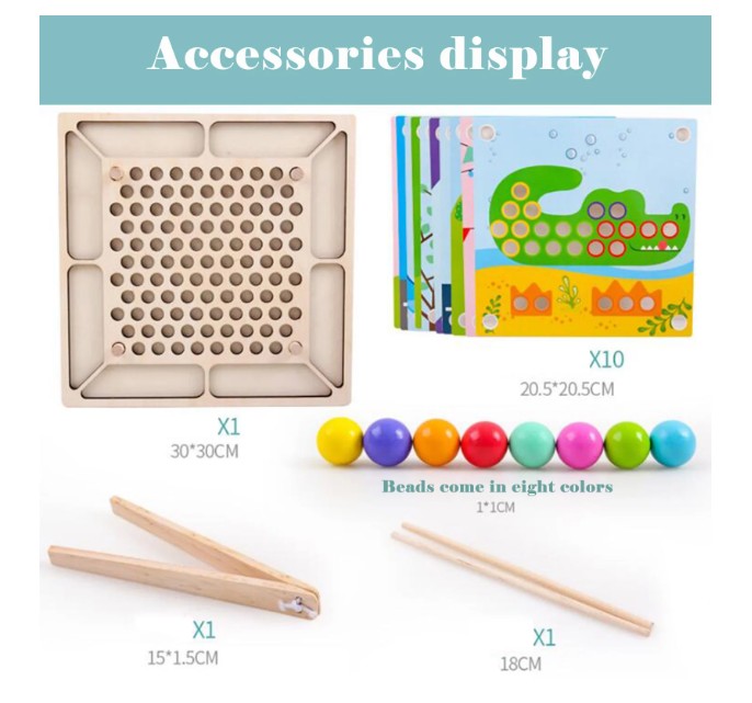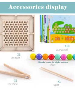 Acest joc educativ Montessori cu bile colorate este conceput pentru a dezvolta coordonarea, atenția și logica copiilor într-un mod distractiv și interactiv. Prin folosirea bețișoarelor, pensetei sau bețelor tip chopsticks, cei mici vor exersa motricitatea fină și își vor îmbunătăți concentrarea în timp ce creează imagini colorate pe tăblița de joc.