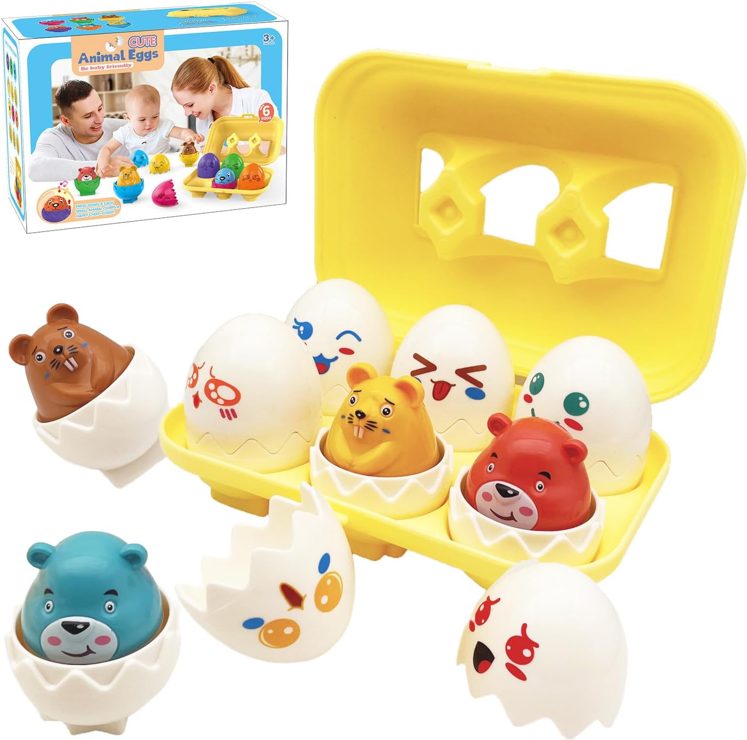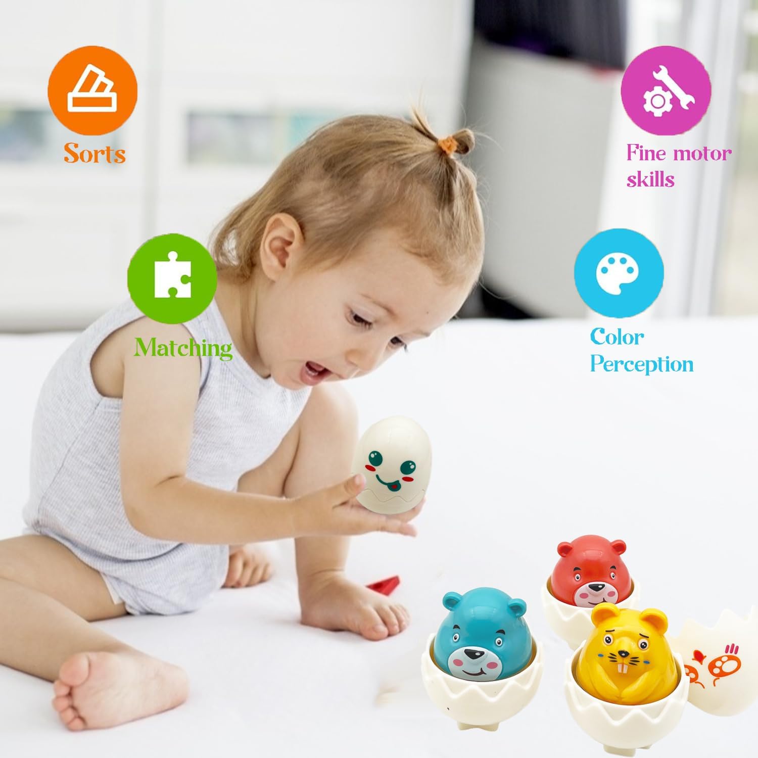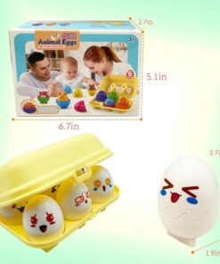 Acest set educațional sub formă de ouă surpriză este conceput pentru a transforma joaca într-o experiență de învățare interactivă și distractivă. Jocul dezvoltă recunoașterea a formelor, a culorilor și a animalelor, stimulând în același timp gândirea logică și coordonarea mână–ochi.