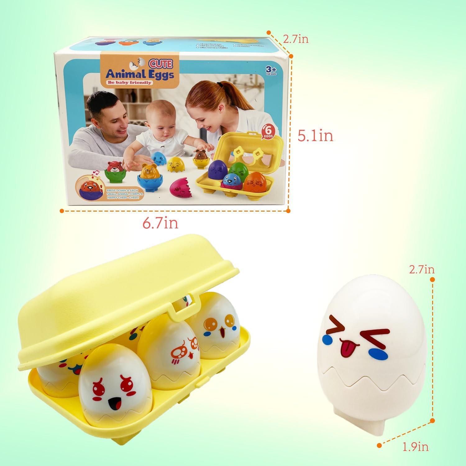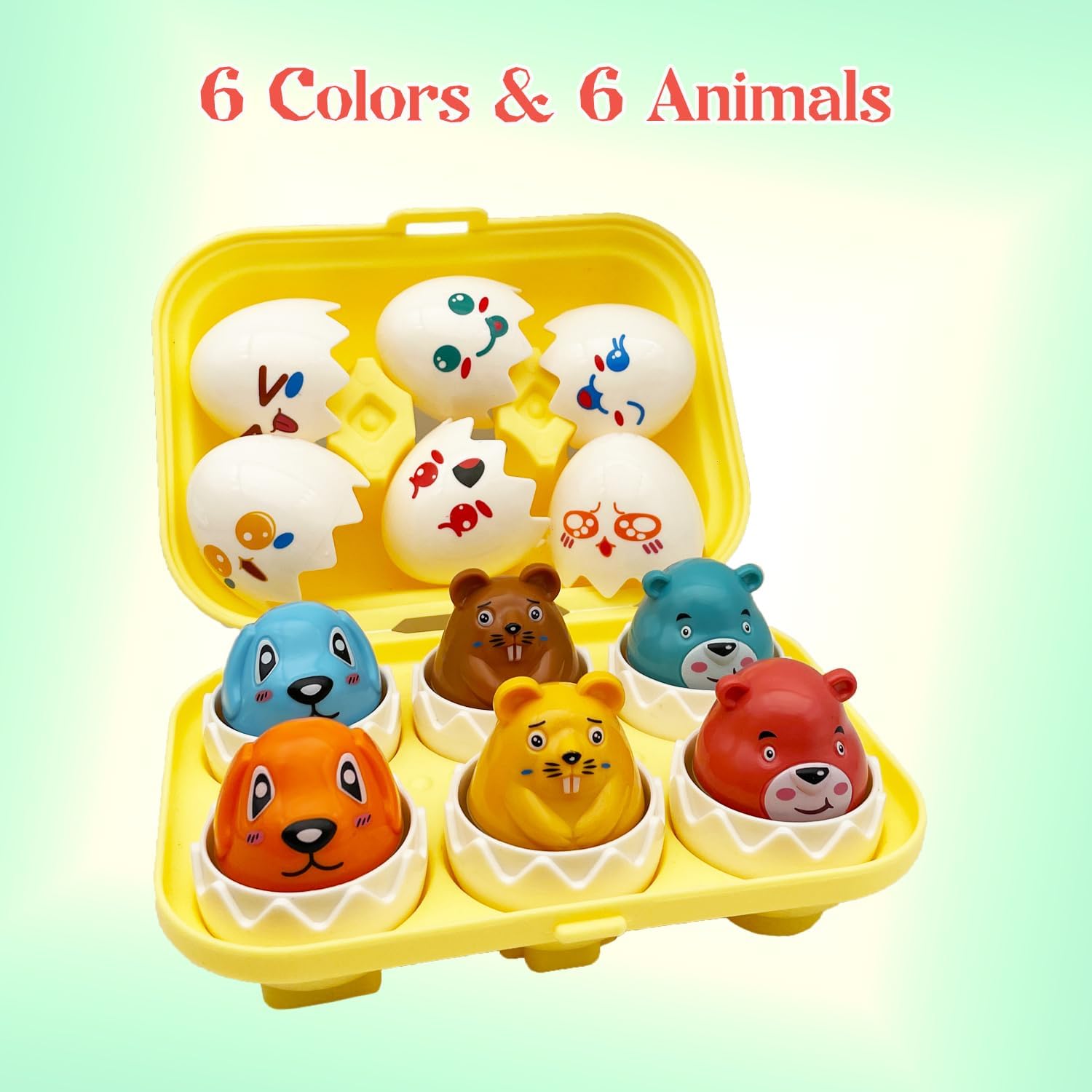 Setul conține: 6 ouă educaționale (fiecare ou se desface și ascunde în interior un animal sau o formă).