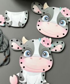 Jocul de șnuruit Văcuța este o jucărie educativă din carton gros, cu design adorabil și culori pastelate, concepută pentru a dezvolta răbdarea, coordonarea mână–ochi și motricitatea fină a copiilor. Fiecare piesă are perforații speciale prin care copilul trece șiretul inclus, antrenându-și îndemânarea și concentrarea într-un mod distractiv și creativ.