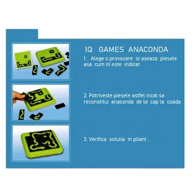 - Conține: tabla de joc, piesele anacondei, pliant cu soluții și provocări