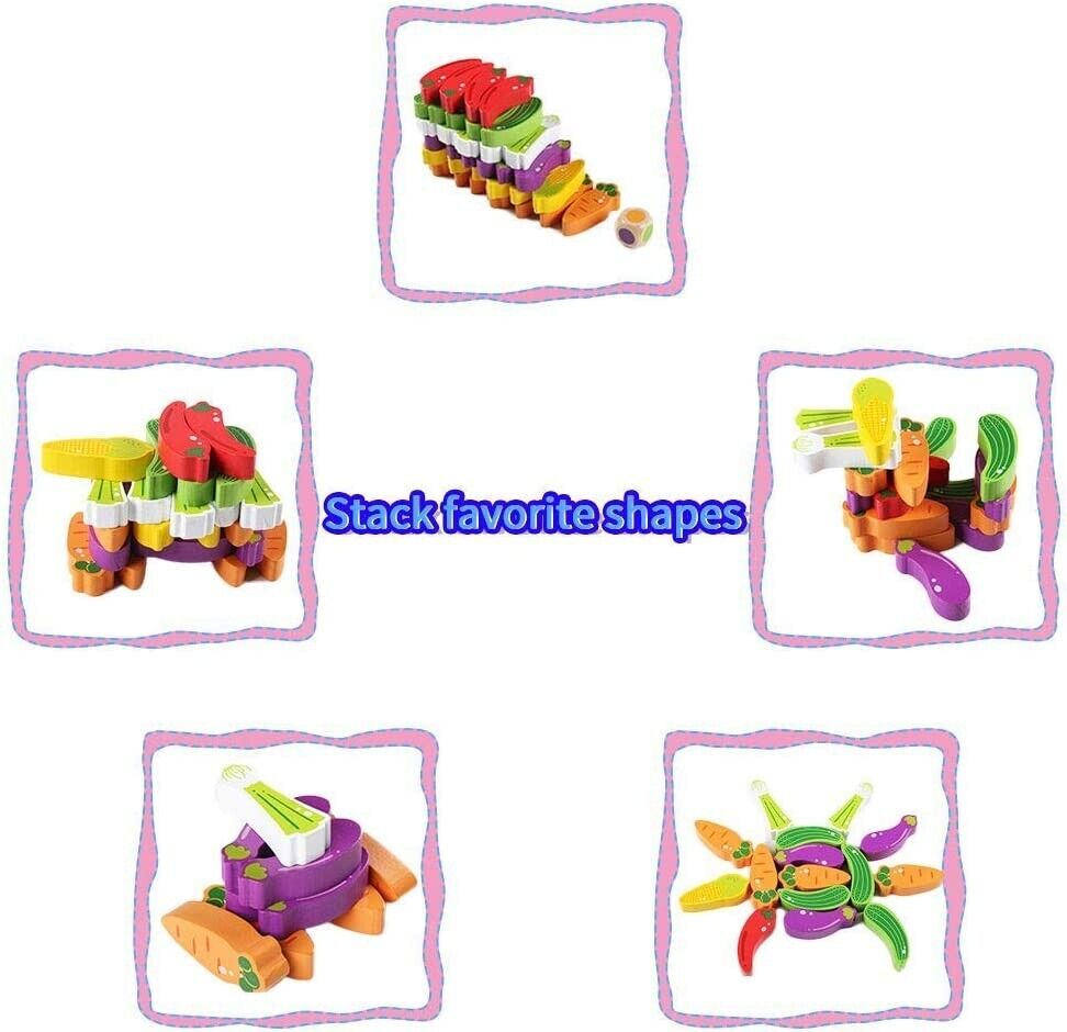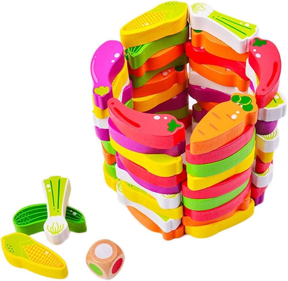 Turnul instabil Jenga, joc societate pentru copii – cuburi tematica legume, joc indemanare,dexteritate si logica.