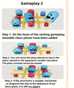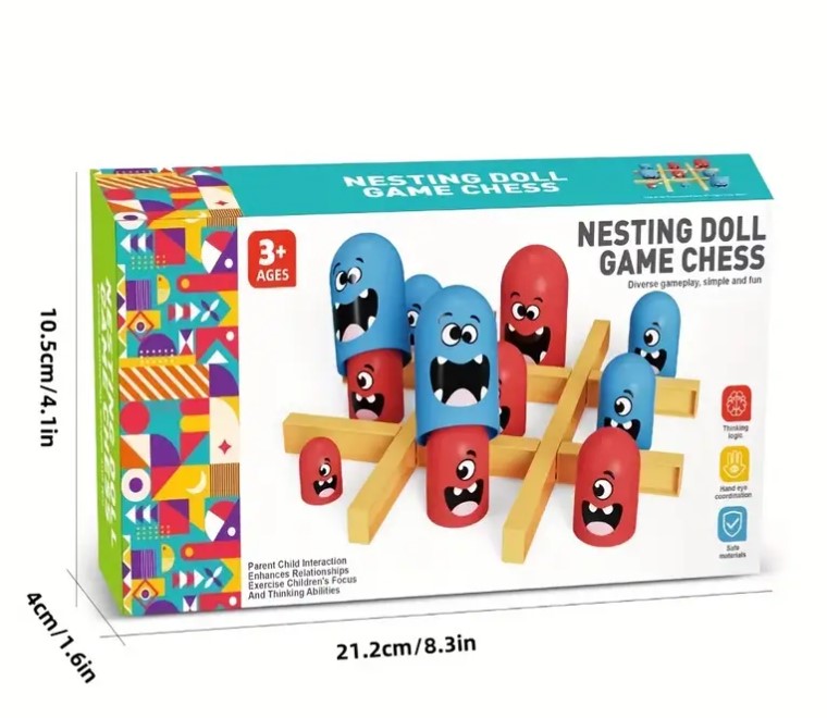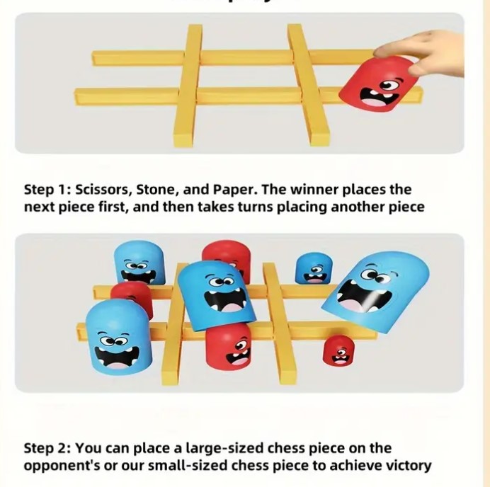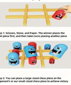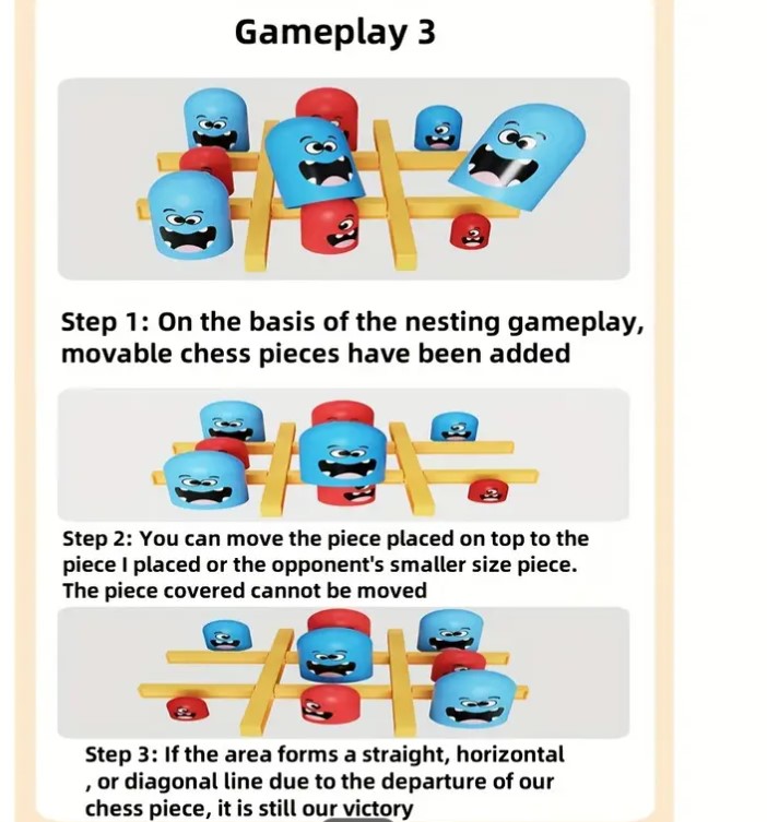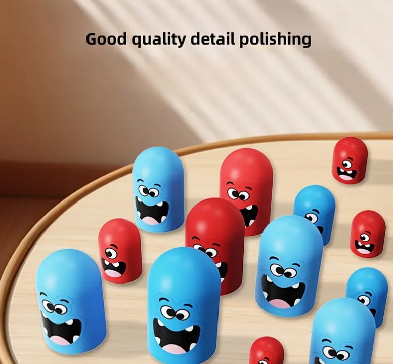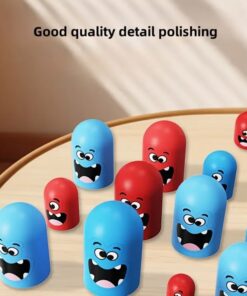 Piesele colorate, cu fețe amuzante, sunt realizate din materiale sigure și plăcute la atingere, iar dimensiunile generoase le fac ușor de manevrat de către cei mici. Sistemul inovator cu piese de dimensiuni diferite permite „capturarea” pieselor adversarului, adăugând un nivel suplimentar de strategie și distracție.