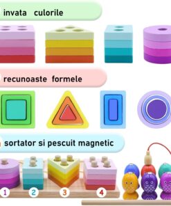 - Pescuitul magnetic: Copilul folosește undița pentru a prinde piesele magnetice în formă de peștișori, îmbunătățindu-și dexteritatea.