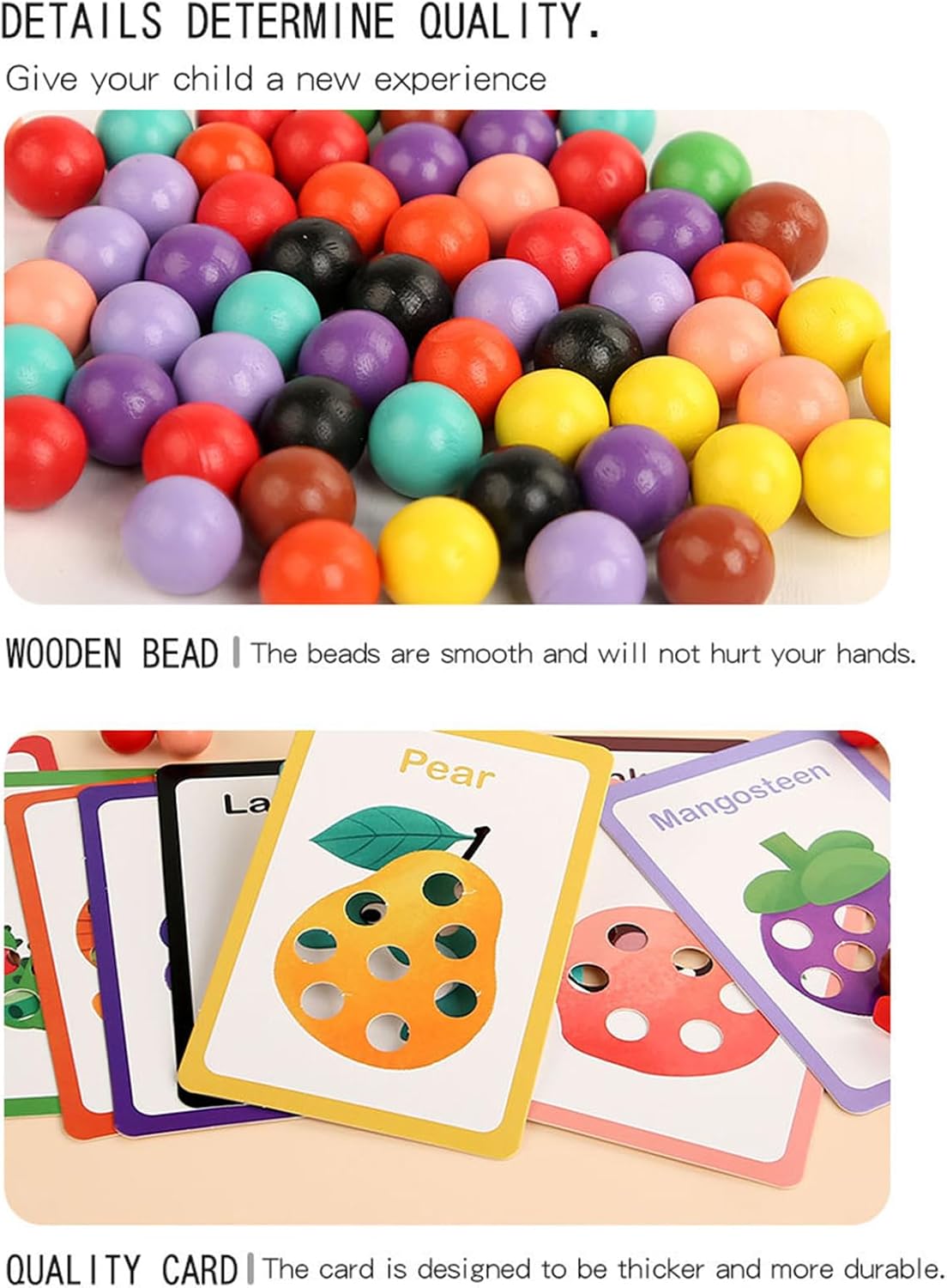 Copilul sortează bilele colorate după nuanță, asociindu-le cu cardurile ilustrate (animale, fructe).