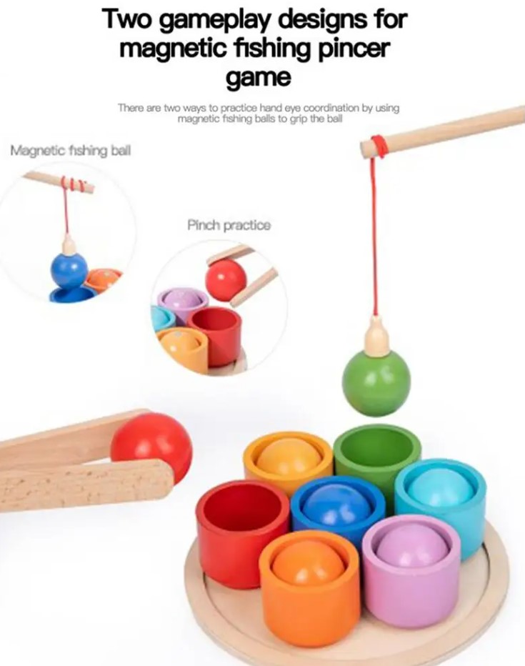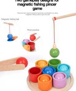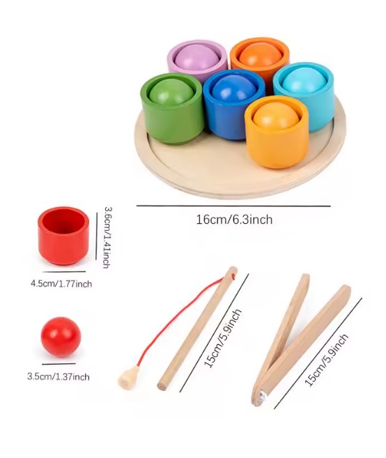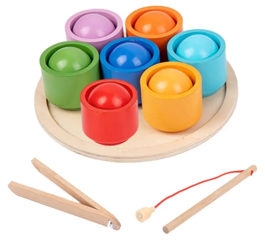 Setul conține 7 cupe colorate din lemn, 7 bile asortate magnetic, pensetă din lemn și undiță magnetică, toate special create pentru mâinile mici ale copiilor.